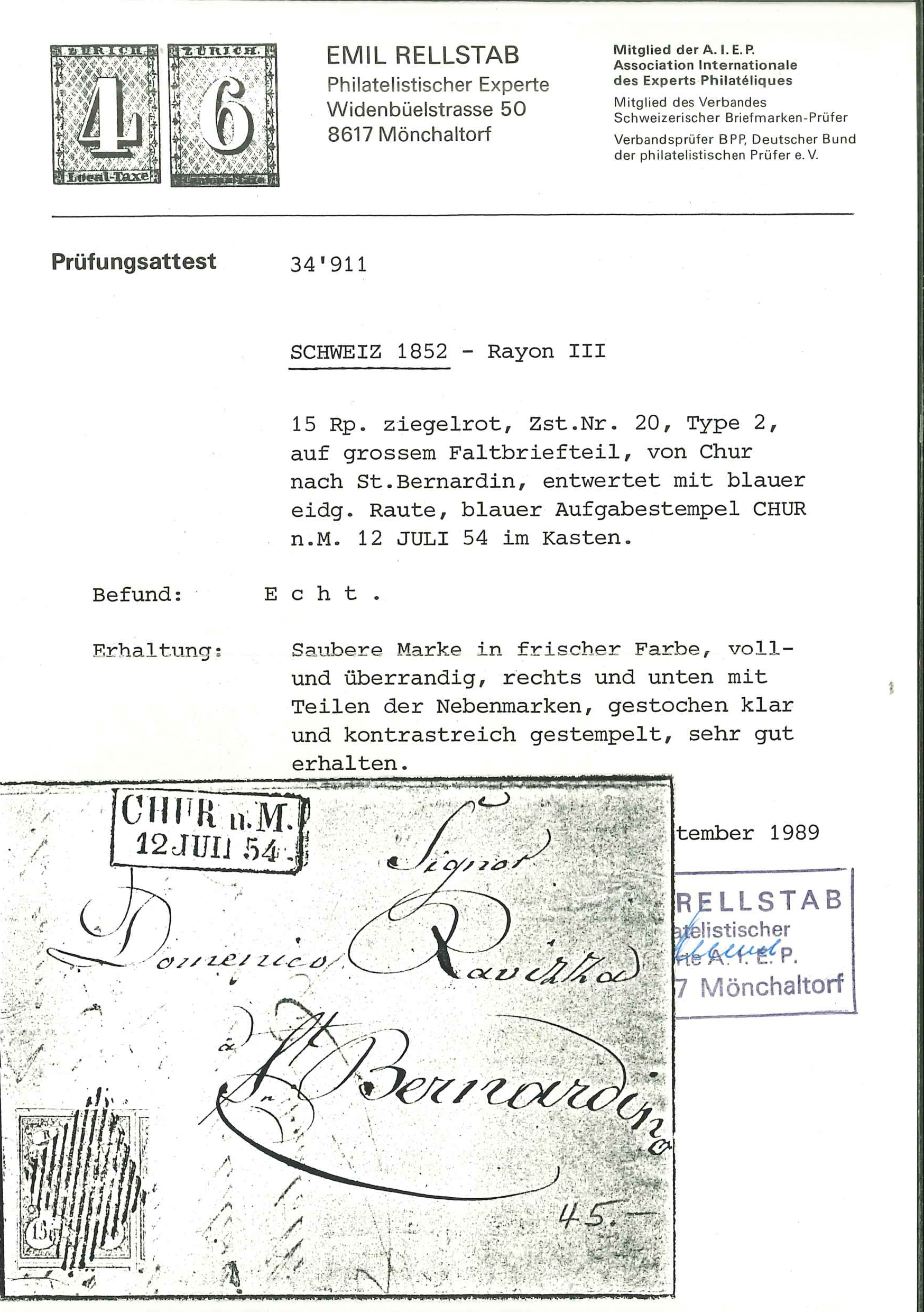 blauer eidgenössischer Raute und nebengesetzt blauer Kastenstempel « CHUR n. M./ 12 JULI 54 » und rückseitig Transit-Stempel « SPLÜGEN 13 7 54 ». Ein Prachtbrief im 3. Briefkreis. Attest Rellstab 1989. (Image 1)