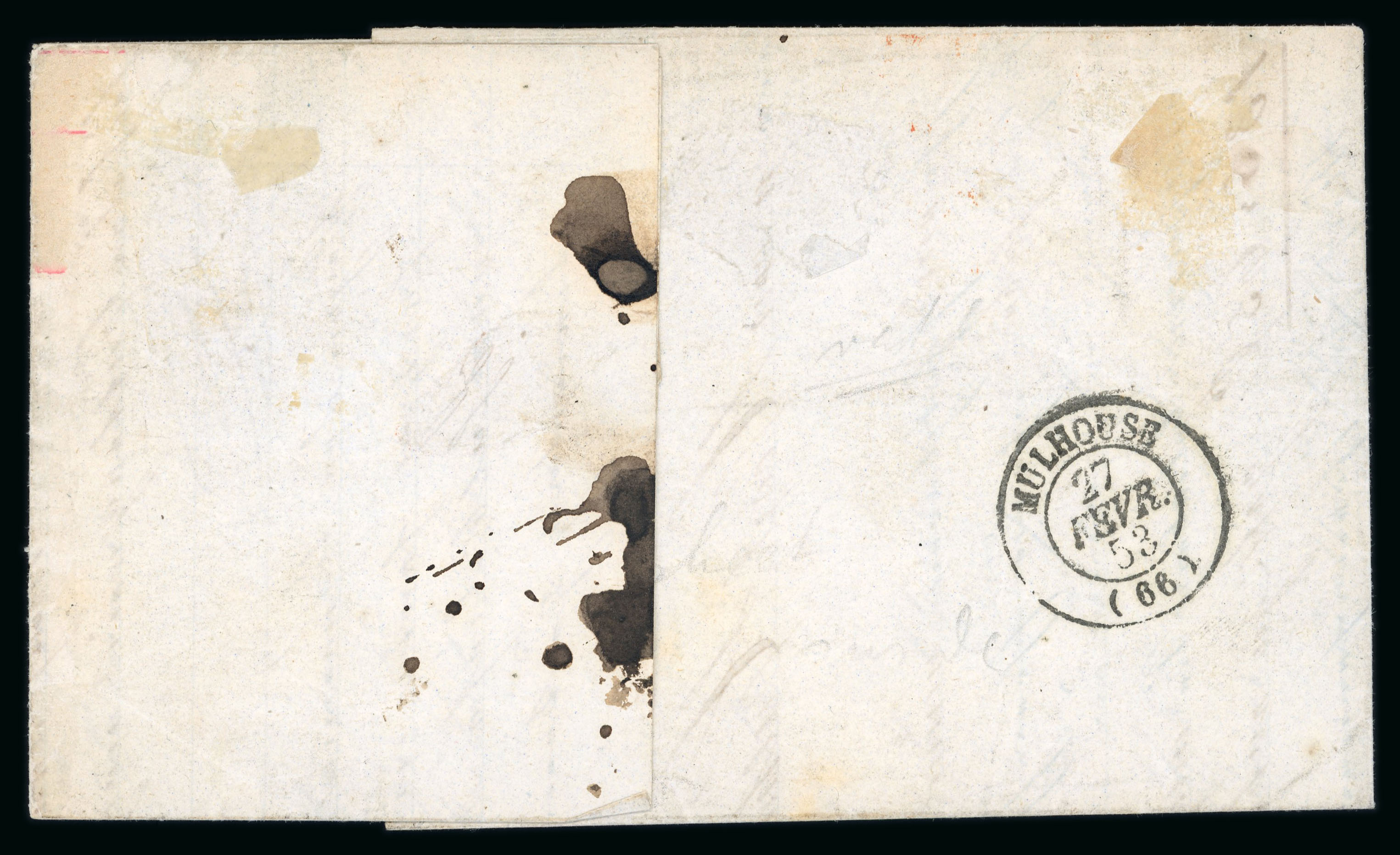 1853, Rayon III grosse Wertziffern, in frischer Farbe, allseits breitrandig geschnitten, Trennlinien auf allen Seiten sichtbar, auf Faltbrief von Basel nach Mühlhausen (Frankreich), übergehend entwertet mit schwarzer eidgenössischer