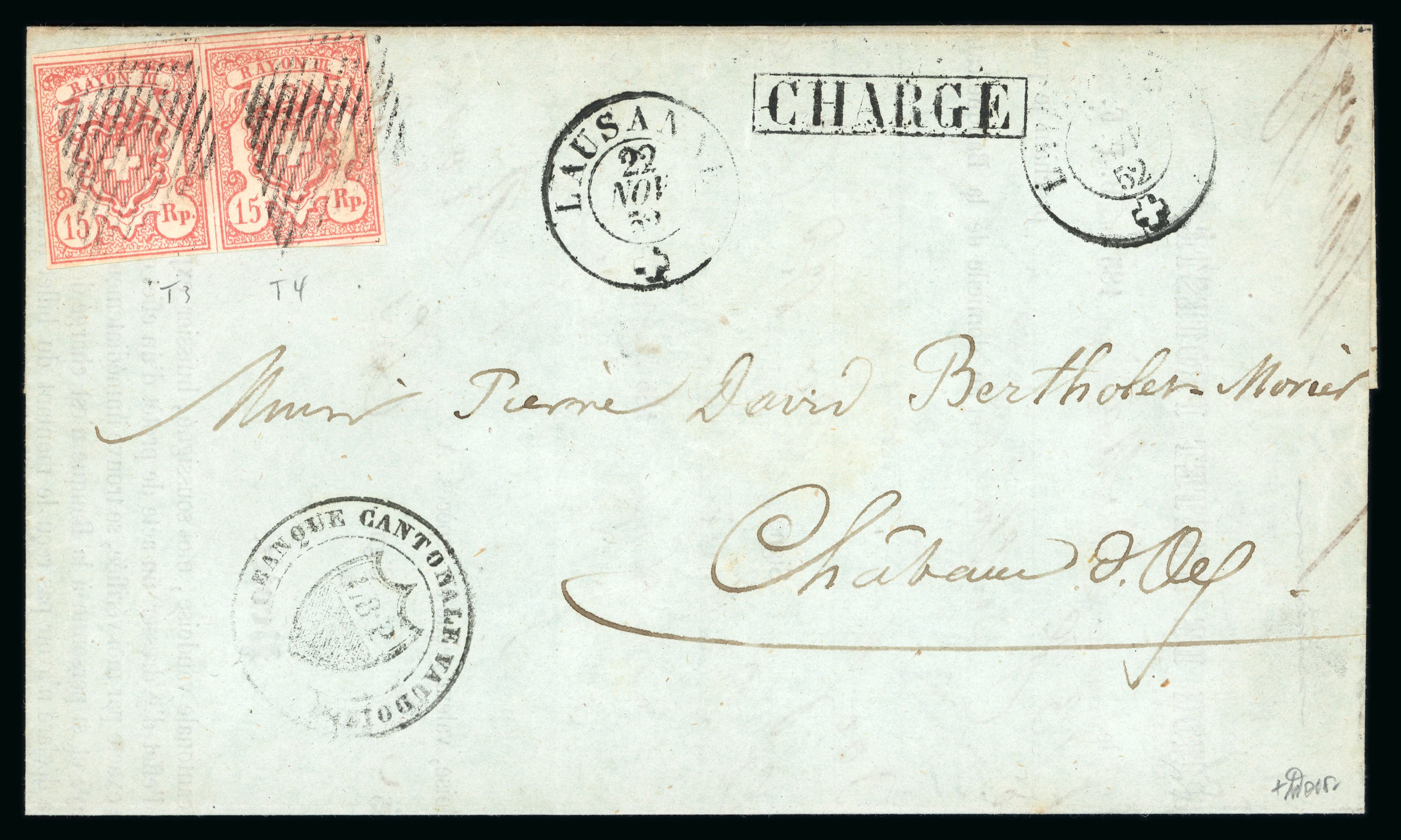 1852, Rayon III grosse Wertziffern im waagerechten Paar, Typen 3 und 4, farbfrisch, allseits voll- bis breitrandig geschnitten, auf Brief von Lausanne nach Château d’Oex, leicht und übergehend entwertet mit schwarzer eidgenössischer