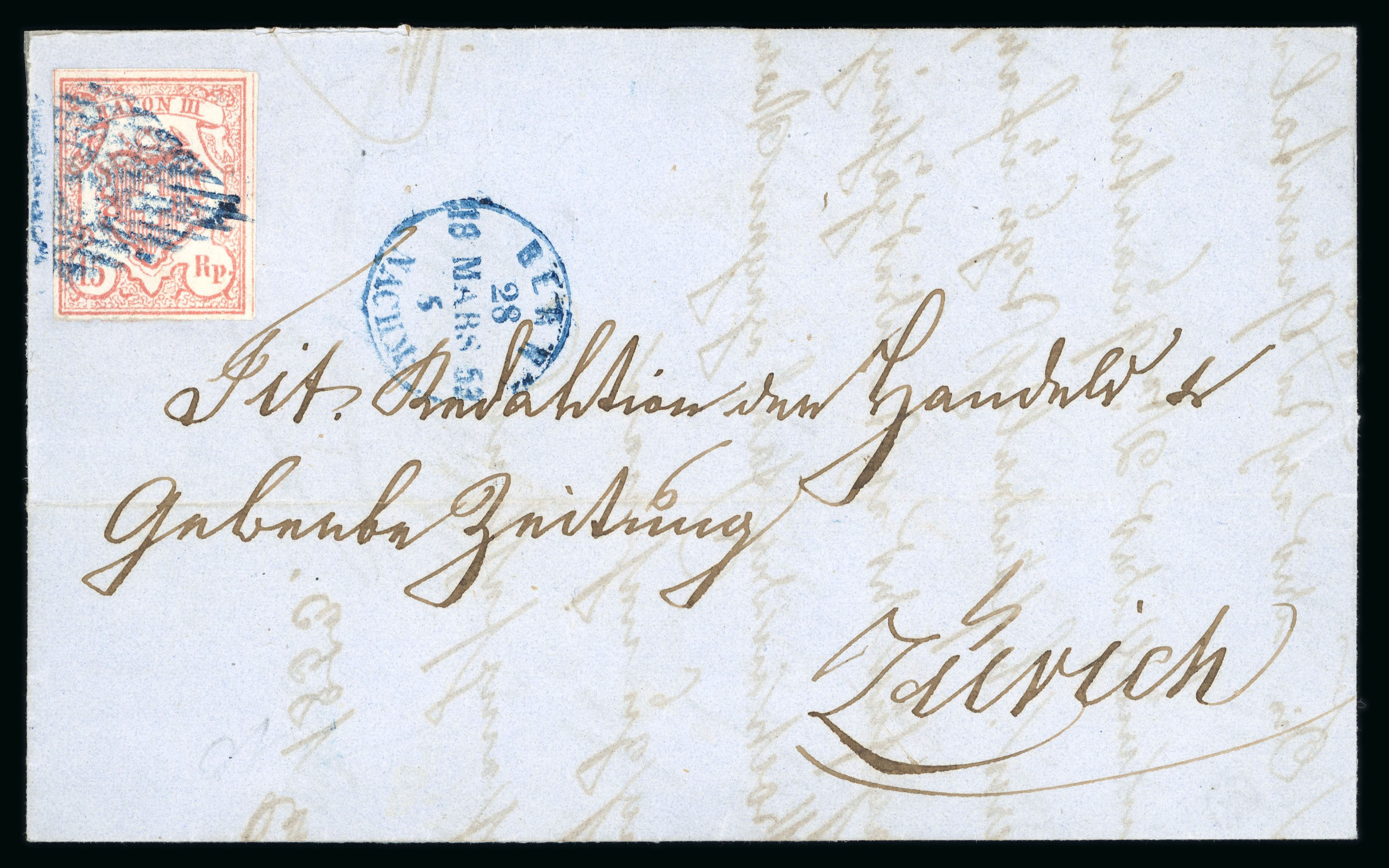1853, Rayon III, grosse Wertziffern, Type 8, farbintensiv, allseits breitrandig, Trennlinien auf 2 Seiten komplett, auf Brief von Bern nach Zürich, kontrastreich entwertet mit blauer eidgenössischer Raute und nebengesetzt « BERN 28 MARS