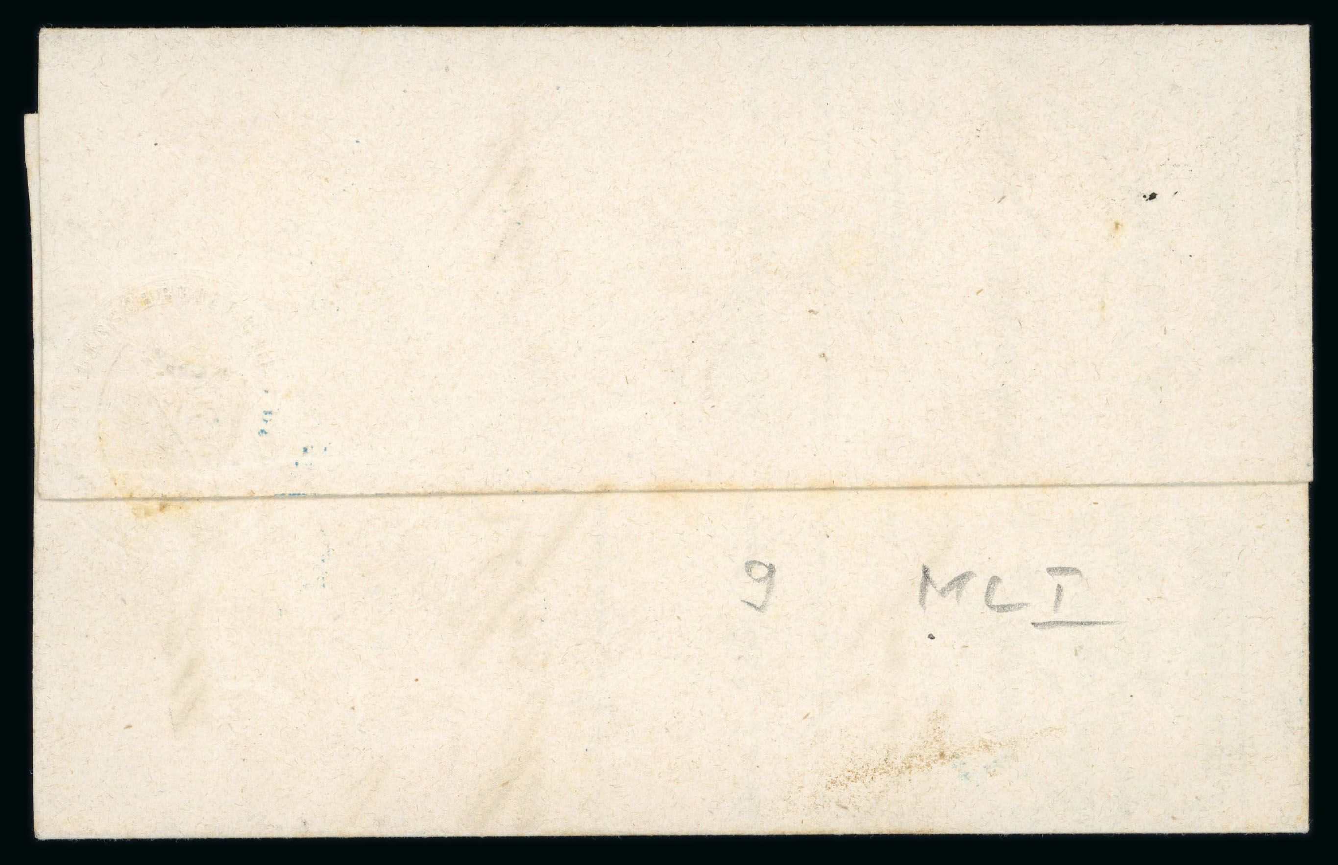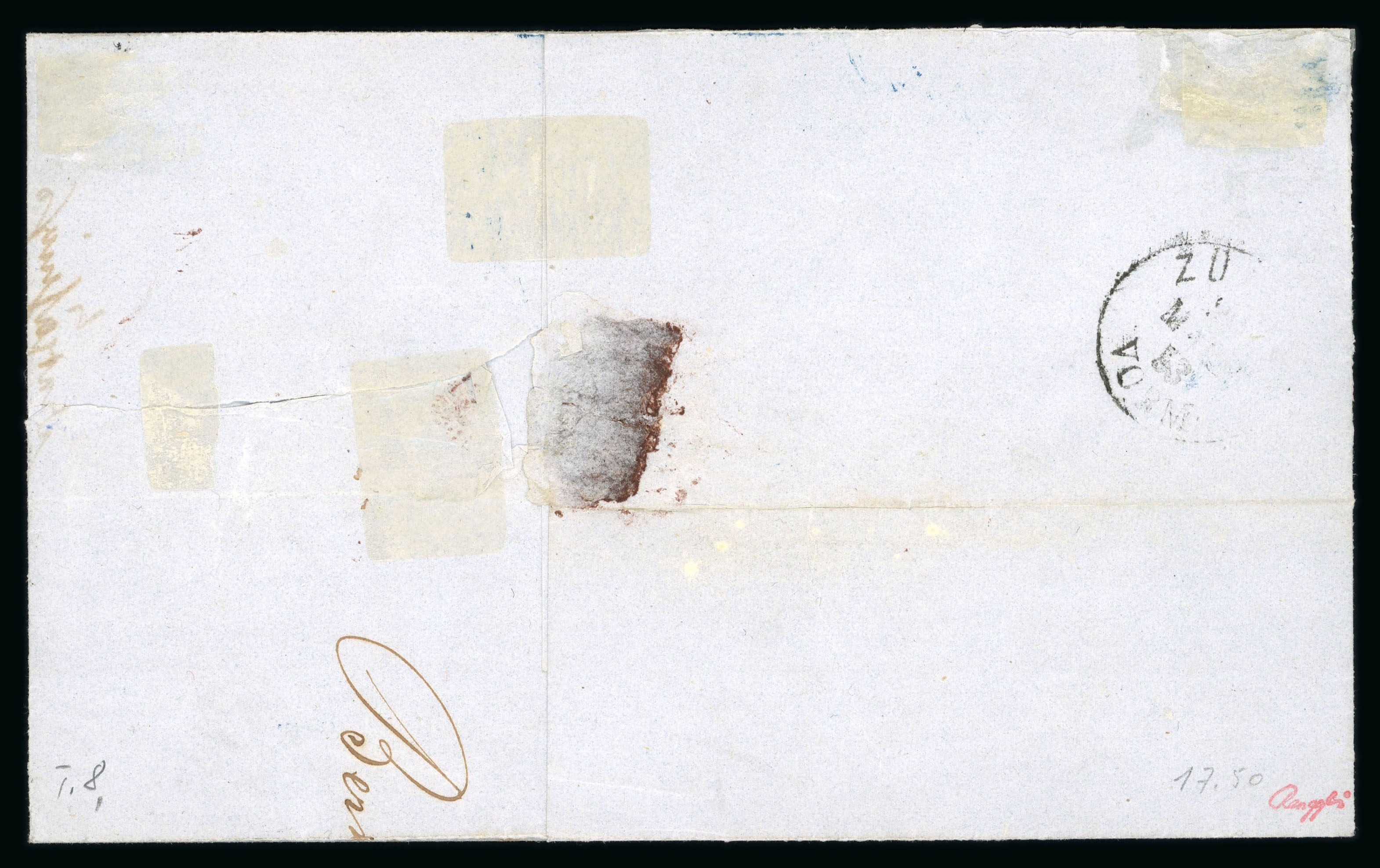 1854, Rayon III grosse Wetziffern, farbintensiv und allseitig breitrandig mit Teilen von drei Nachbarmarken, auf schönem Faltbrief (linke Seitenklappe fehlend) von Chur nach San Bernardino über den Splügen Pass, deutlich entwertet mit