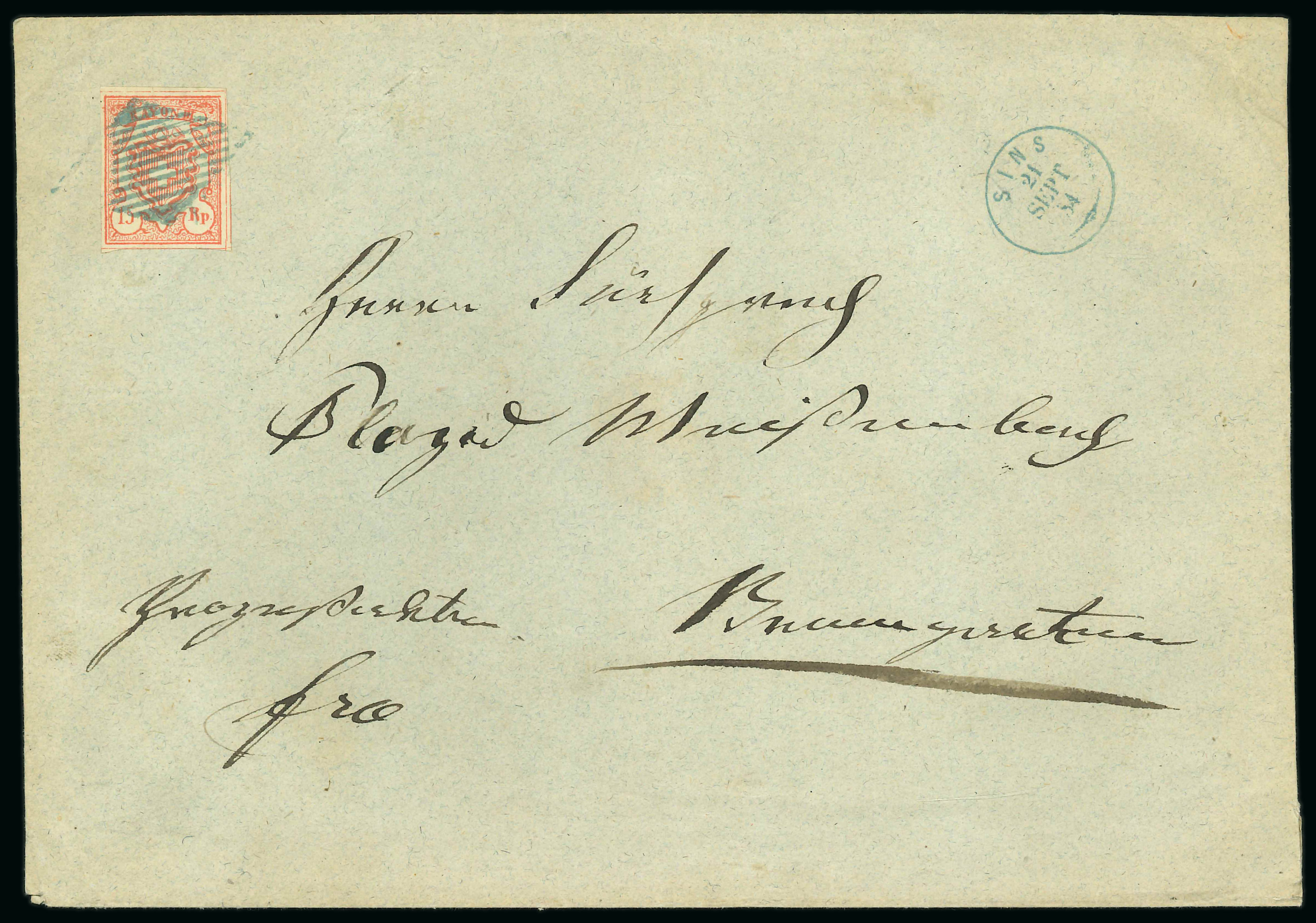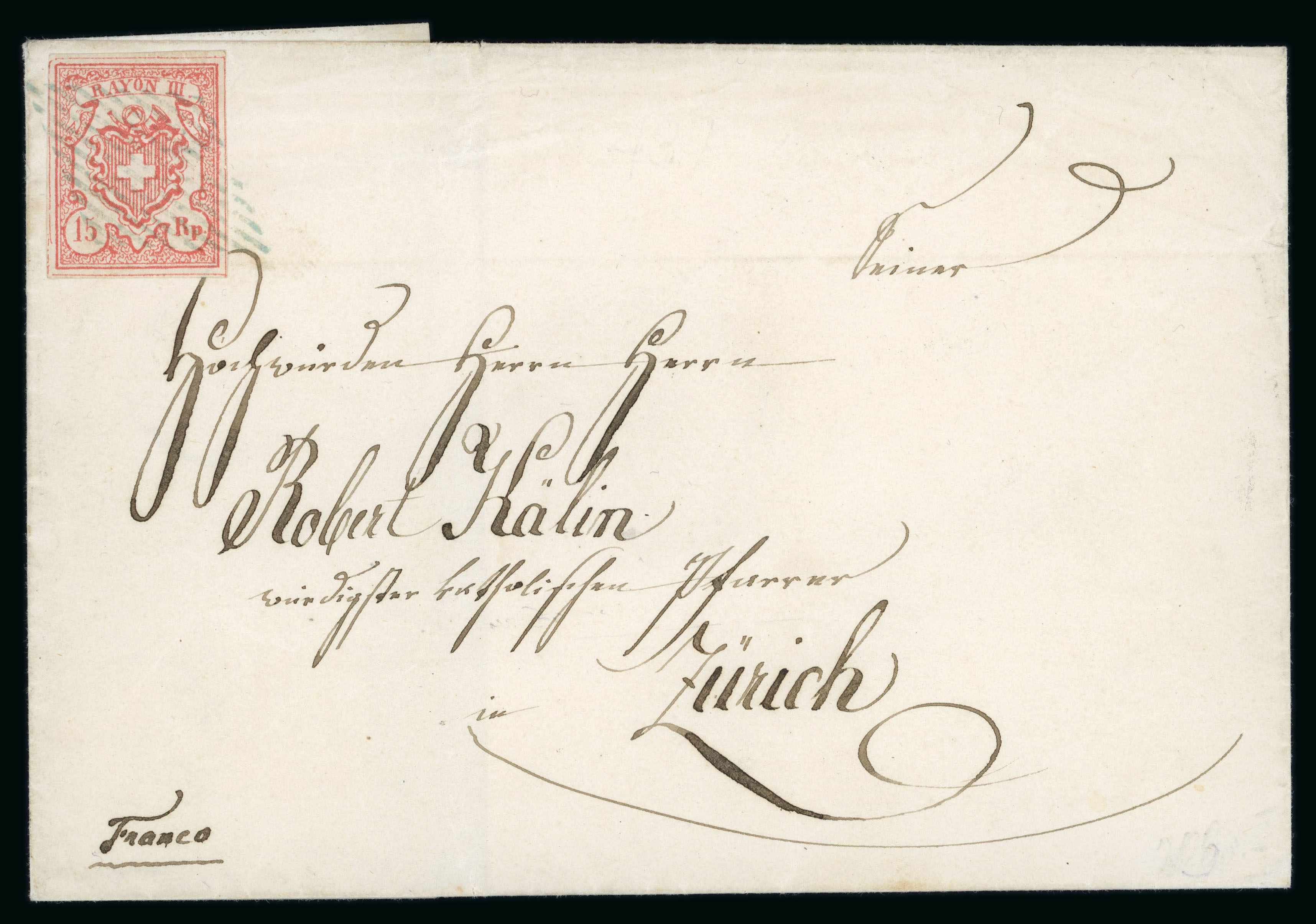 1854, Rayon III grosse Wertziffern, Type 1, farbintensiv, allseits breitrandig geschnitten, Trennlinien auf allen Seiten vollständig, auf Brief nach Zürich, zart und kontrastreich entwertet mit übergehender blauer eidgenössischer Raute,