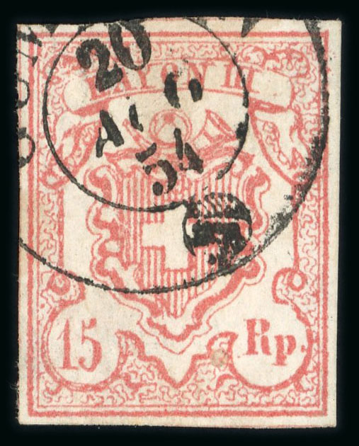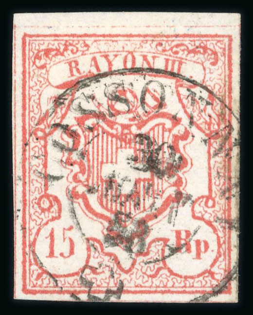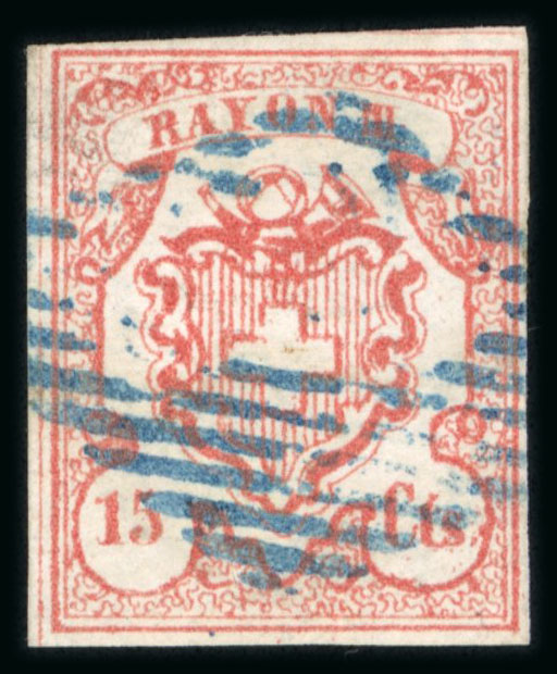 1852, Rayon III, kleine Wertziffern Centimes, farbfrisch, allseits volle bis breite Ränder, kontrastvoll entwertet mit blauer eidgenössischer Raute. Signiert Pfenninger. SBK = CHF 1500. (Image 1)