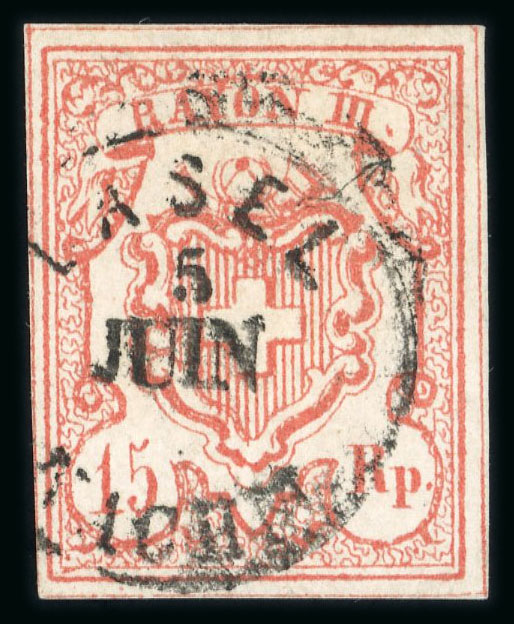 1852, Rayon III grosse Wertziffern, Type 9, farbfrisch, allseits breitrandig geschnitten, Trennlinien auf allen Seiten sichtbar, leicht entwertet mit schwarzem Einkreisstempel « BASEL 5 JUIN NACHM. ». Signiert Moser. SBK = CHF 200. (Image 1)