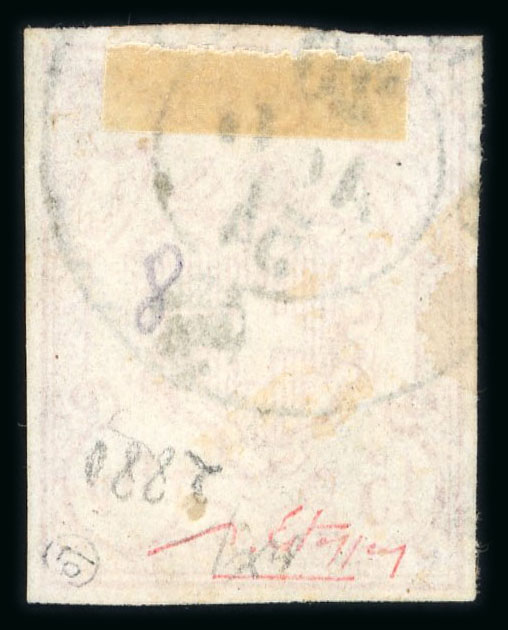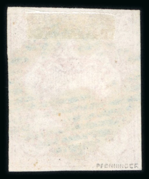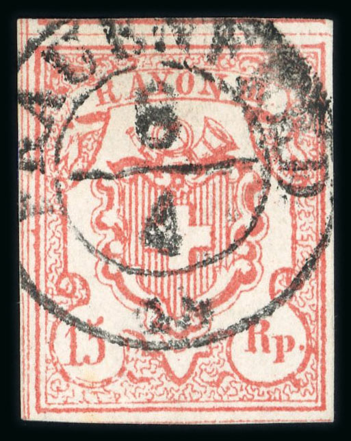 1852, Rayon III grosse Wertziffern, Type 7, farbfrisch, allseits überwandig geschnitten, mit Teilen der oberen Nachbarmarke, zentrisch entwertet mit schwarzem Zweikreisstempel « FRAUENFELD 8 4 ». Ein dekoratives Stück. Attest Hunziker