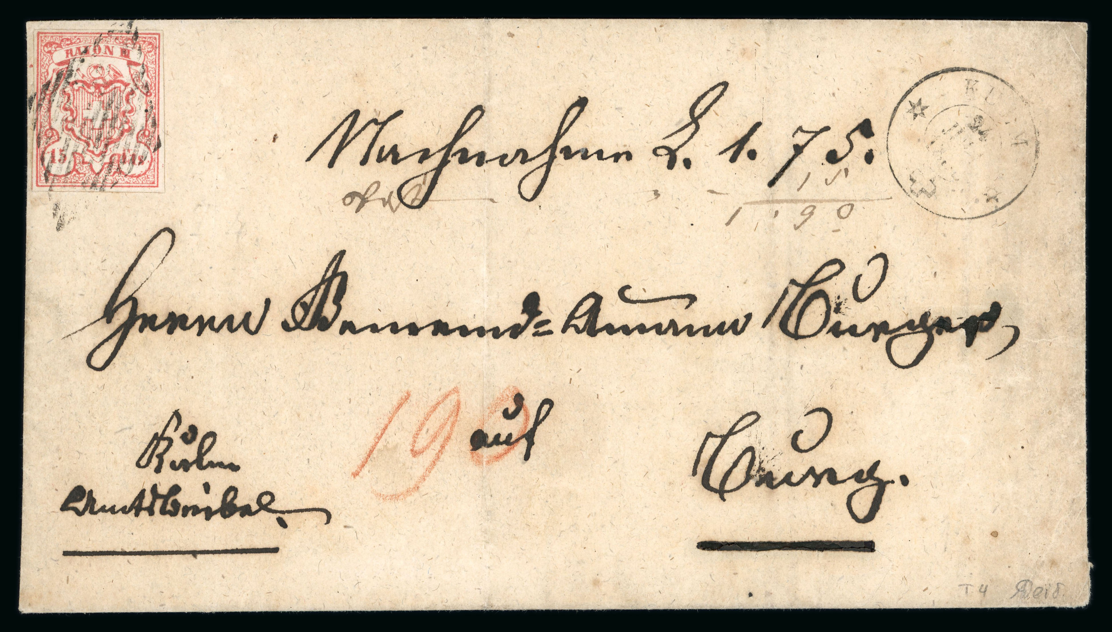 1853, Rayon III kleine Wertziffern Centimes, Type 4, farbfrisch, allseits volle bis breite Ränder, auf Brief von Kulm, leicht und dekorativ entwertet mit schwarzer eidgenössischer Raute und nebengesetzt « KULM 24 JUNI 1853 ». Ein