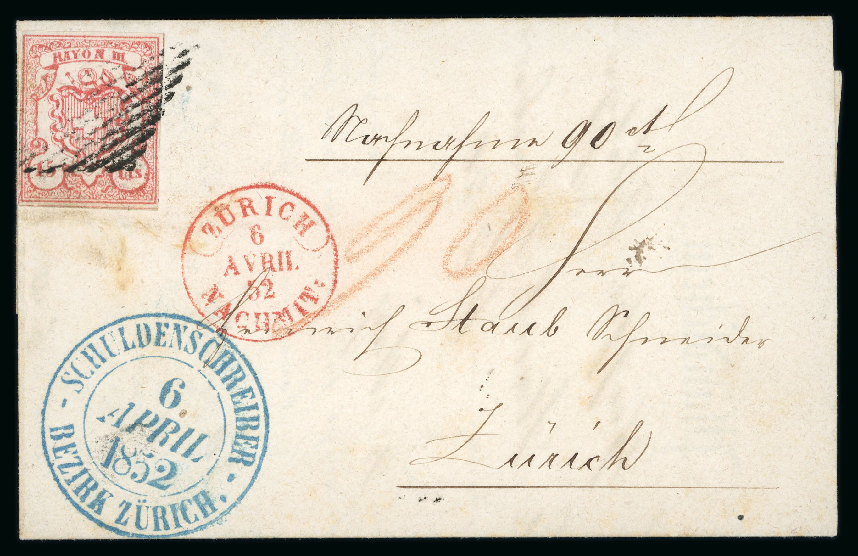 1852, Rayon III kleine Wertziffern Centimes, Type 9, Stein MMII, farbfrisch, allseits breitrandig, unbedeutender Eckbug, auf Ortsnachnahme von Zürich, leicht und übergehend entwertet mit schwarzer eidgenössischer Raute und nebengesetzt «