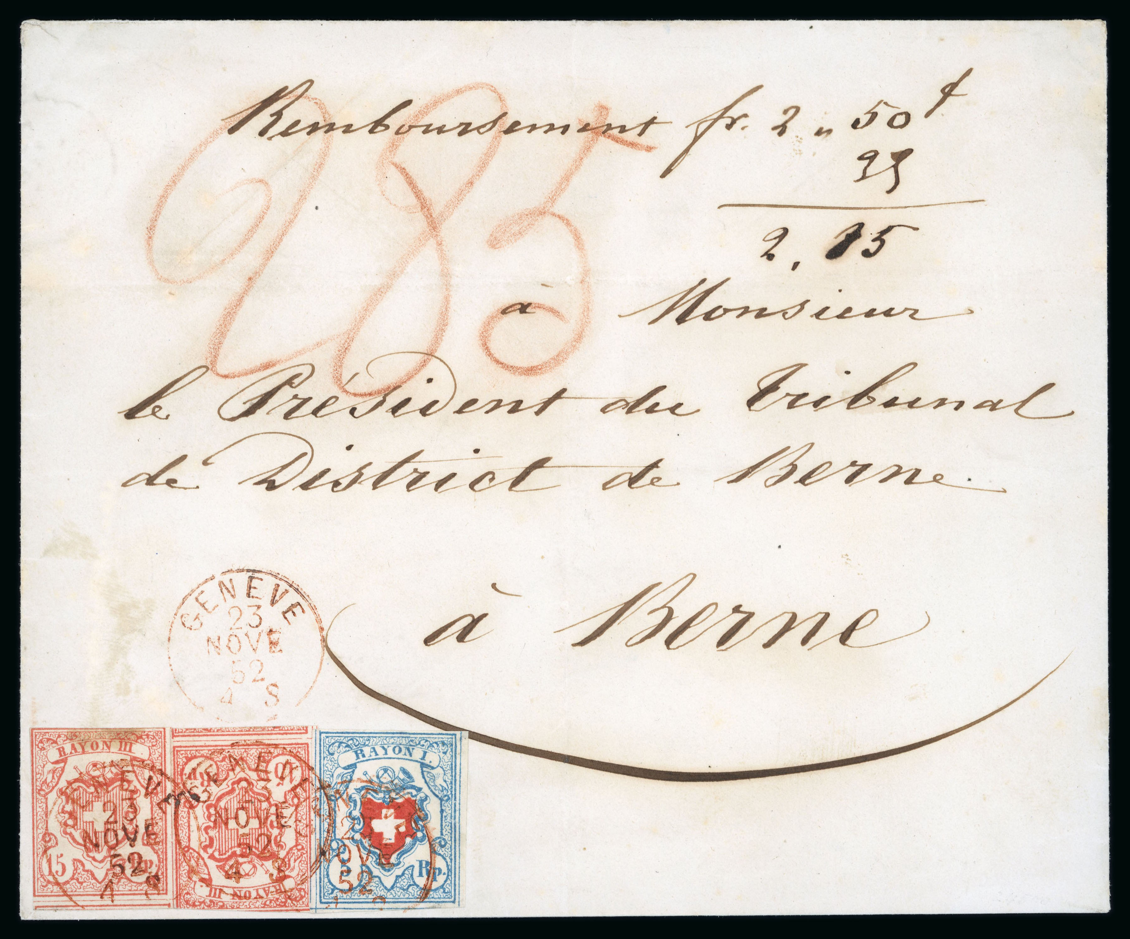 Rayon I rechts mit kleinem unbedeutenden Riss, auf Nachnahme-Brief von Genf nach Bern, je dekorativ entwertet mit rotem Einkreisstempel « GENEVE 23 NOVE 52 4 S » und nebengesetzt wiederholt, rückseitig dekorativer Genfer Amtsstempel, sowie