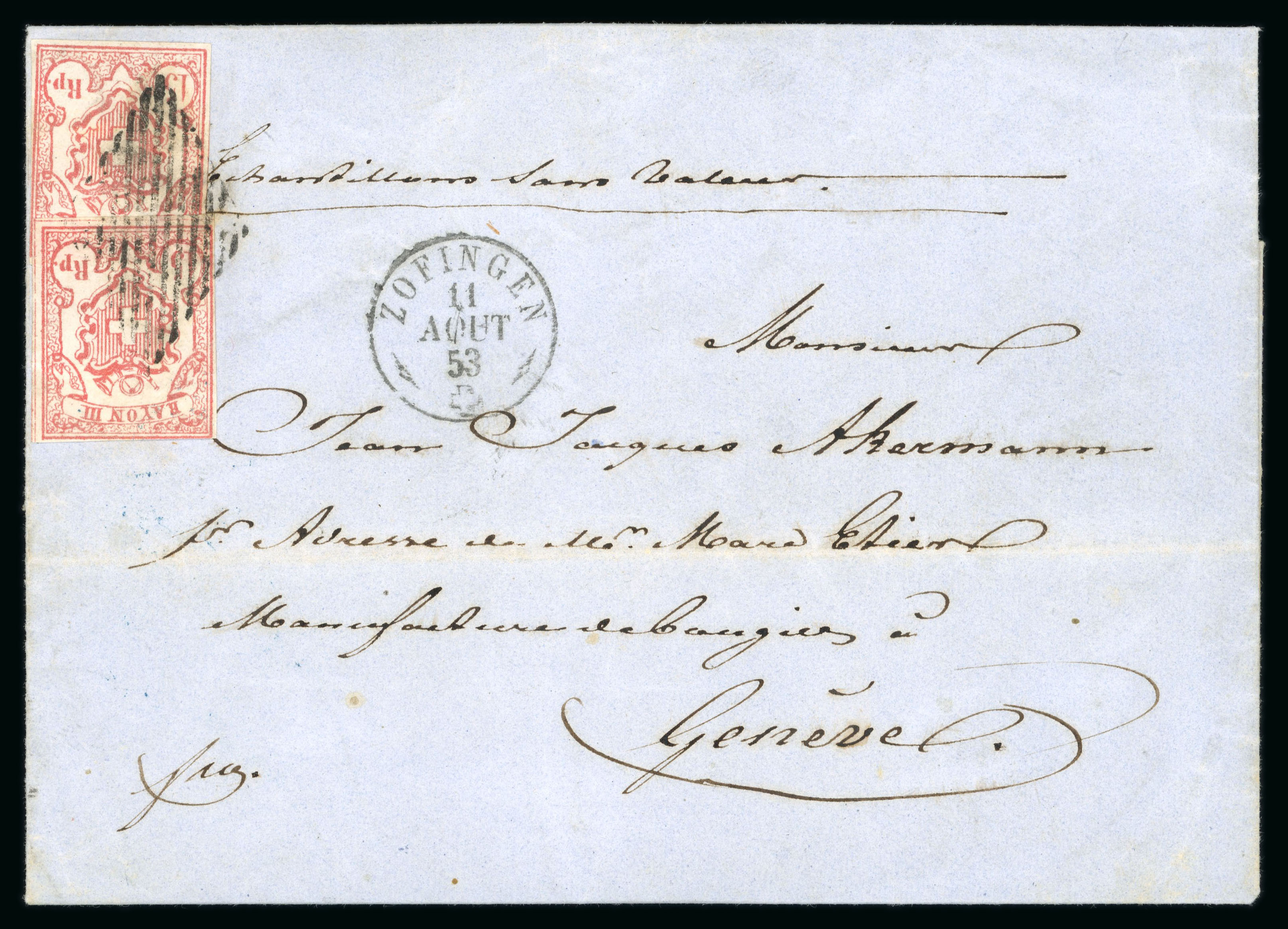 1853, Rayon III grosse Wertziffern, 2 Einzelmarken, beide Werte allseits gute bis breite Ränder auf Faltbrief « Muster ohne Wert » von Zofingen nach Genf, übergehend entwertet mit schwarzer eidgenössischer Raute und nebengesetzt «