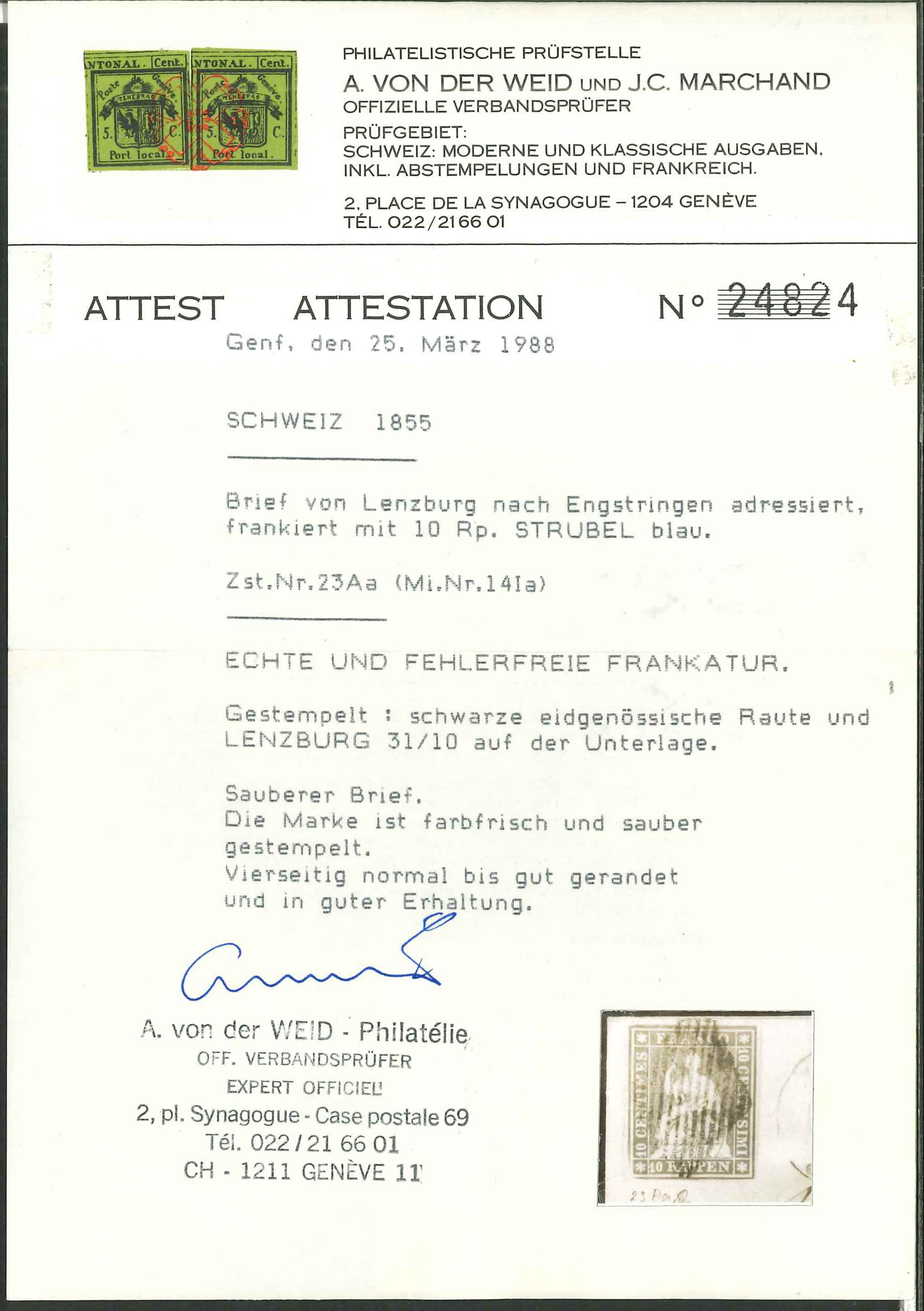 1855, 10 Rp. blau, 1. Münchner Druckperiode, sehr farbfrisch und allseits weissrandig, auf Faltbrief von Lenzburg nach Engstringen, sauber und übergehend entwertet mit schwarzer eidgenössischer Raute und nebengesetzt « LENZBURG 21 10 55 »