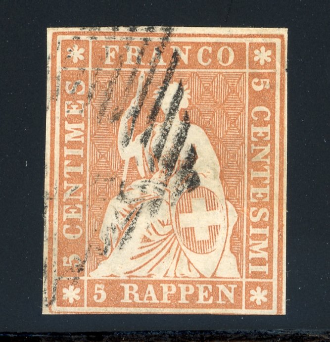 1854, 5 Rp. braun, 1. Münchner Druckperiode, farbfrisch, unten leicht angeschnitten, sonst allseits weissrandig, 2 kleine Eckbüge, Seidenfaden ausgezogen, mit schön ausgeprägtem Relief, leicht entwertet mit schwarzer eidgenössischer