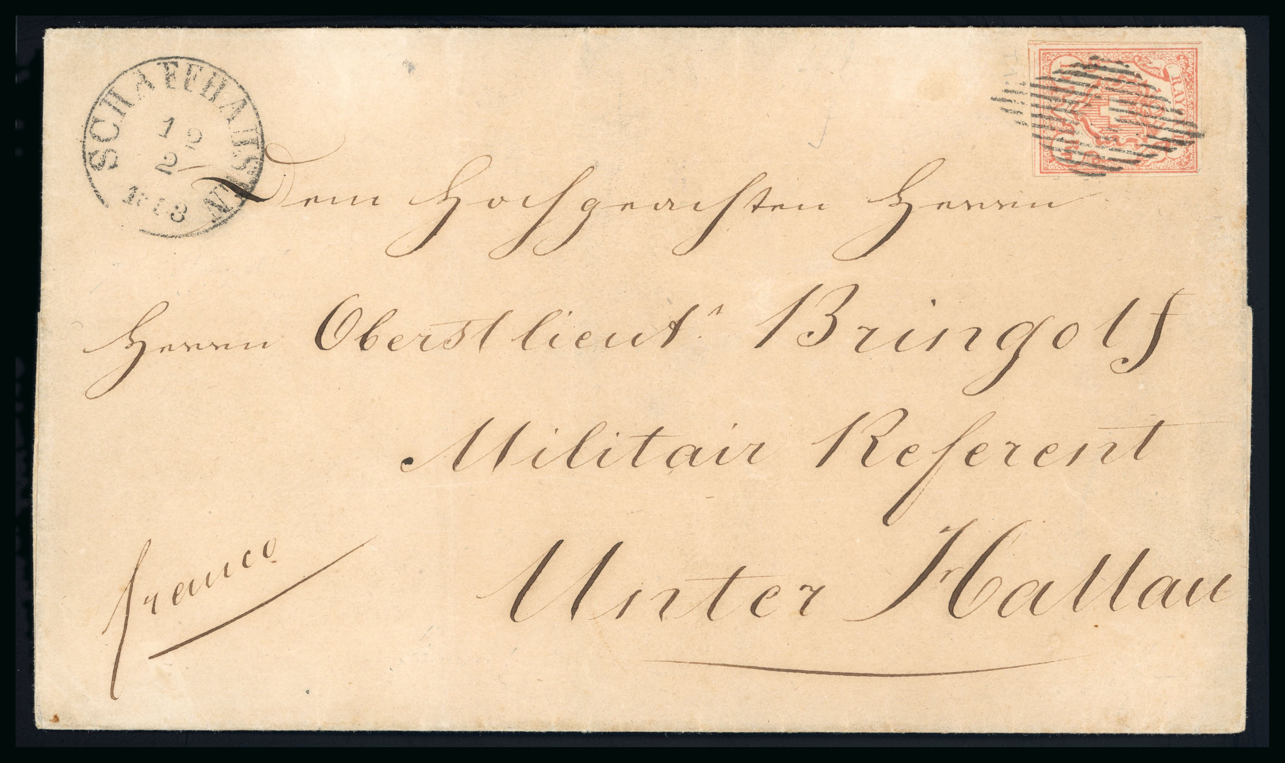 1853, Rayon III, grosse Wertziffern, Type 1, farbfrisch, allseits breitrandig geschnitten, auf Brief von Schaffhausen nach Unterhallau, klar und übergehend entwertet mit schwarzer eidgenössischer Raute und nebengesetzt « SCHAFFHAUSEN 12 2
