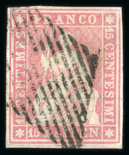1854, 15 Rp. rot, 1. Münchner Druckperiode, farbfrisch, allseits weissrandiges Luxusstück, leicht entwertet mit schwarzer eidgenössischer Raute. Wundervolle Qualität. Signiert Moser, Attest Berra 1979. SBK = CHF 800. (Image 1)