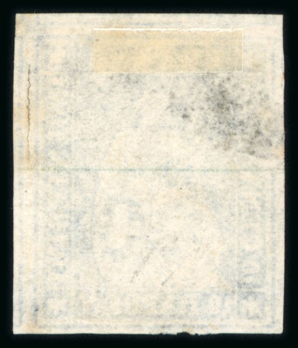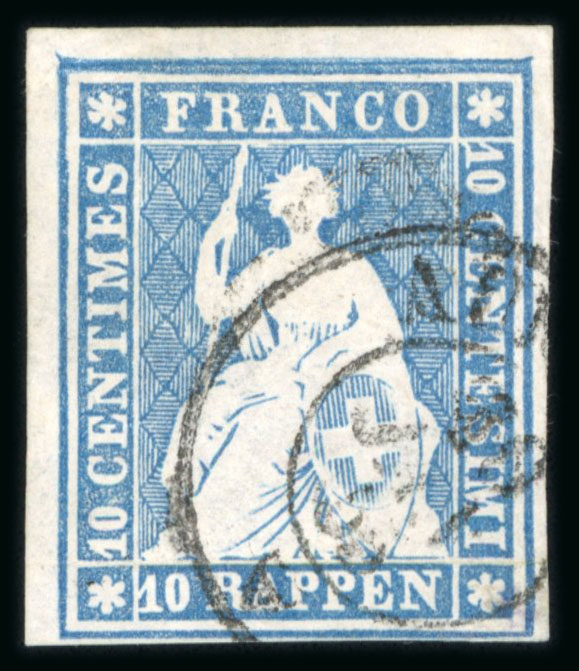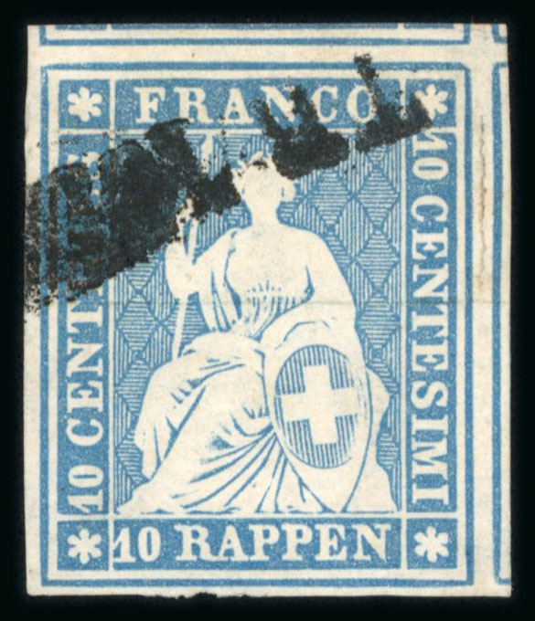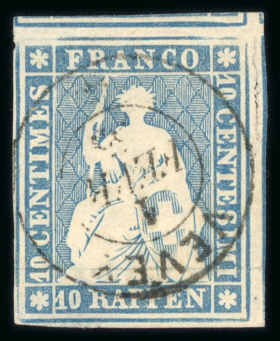 1854, 10 Rp. blau, in frischer Farbe, allseits weissrandig, aus der oberen Bogenecke, schön entwertet mit schwarzem Einkreisstempel. (Image 1)