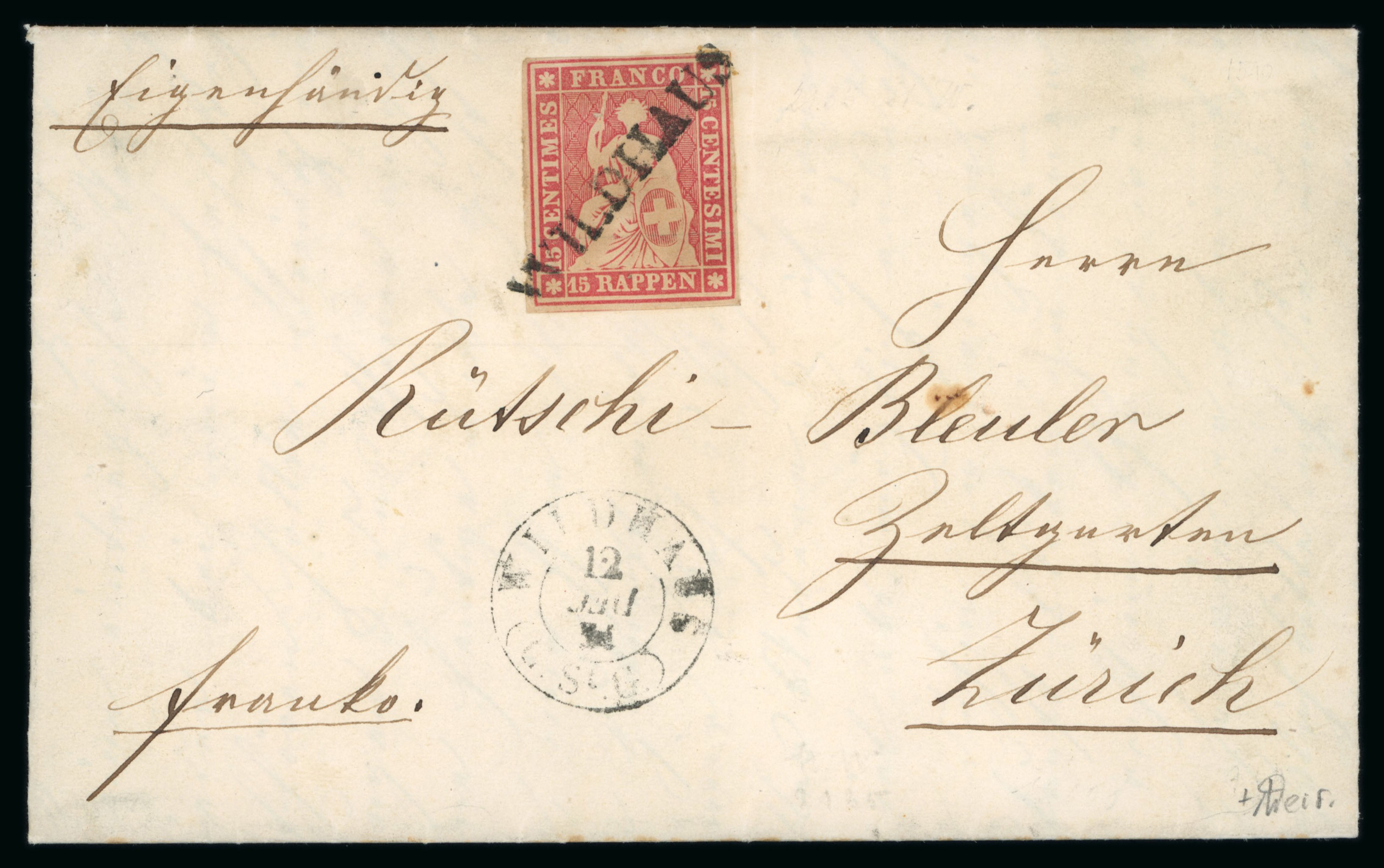 1854, 15 Rp. rot, 3. Münchner Druckperiode, in frischen Farben, allseits weissrandig geschnitten, auf Brief von Wildhaus nach Zürich, klar und übergehend entwertet mit schwarzem Stabstempel « WILDHAUS » (Kanton St. Gallen) und
