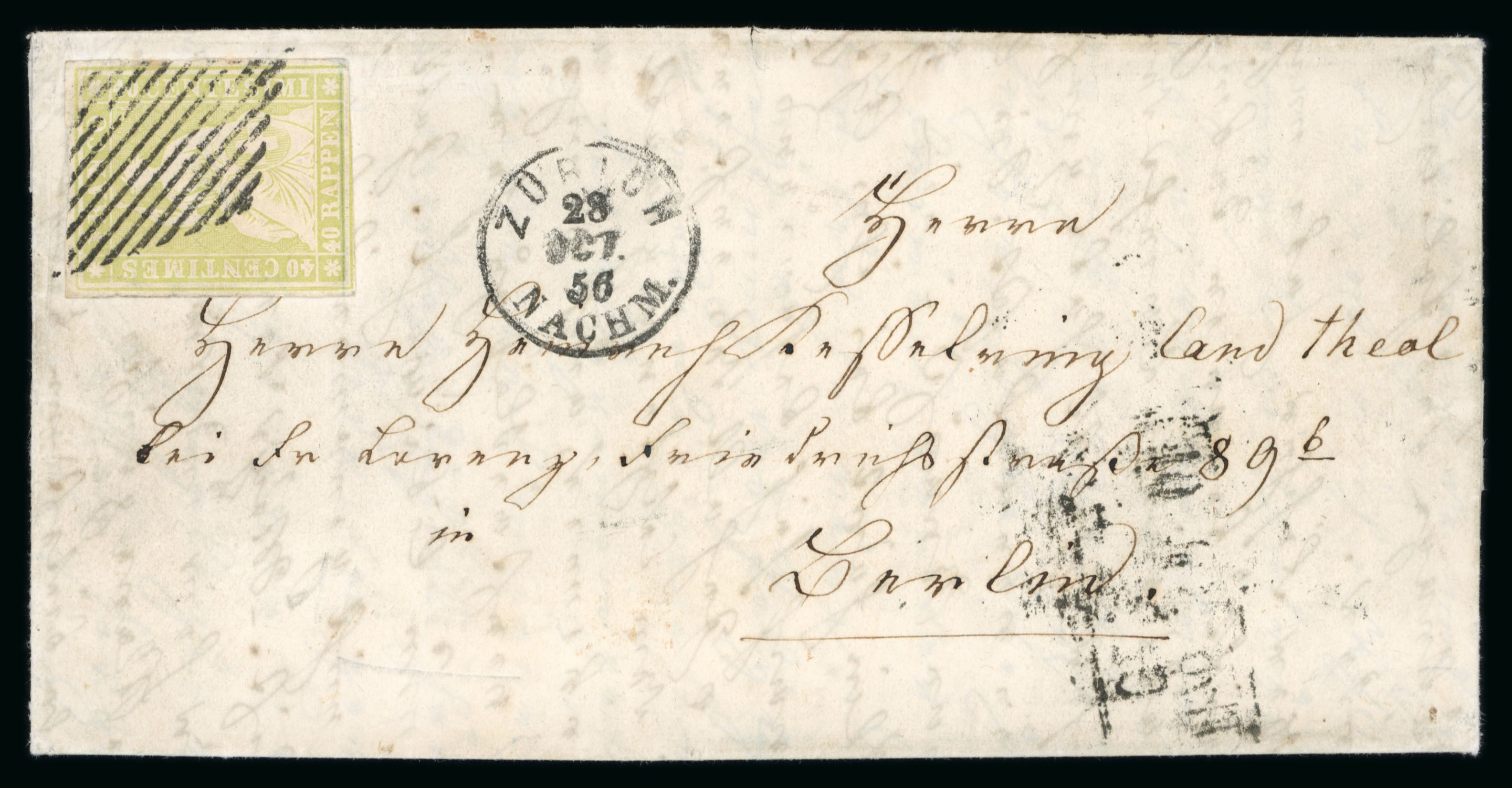 ZURICH 28 OCT. 56 NACHM. »,rückseitig Taxvermerk « 9 » als Weiterfranko für den Postverein und Ankunftsstempel Berlin. Eine sehr schöne und seltene Einzelfrankatur. Atteste Hunziker 1967, Hermann 2024. SBK = CHF 4500. (Image 1)