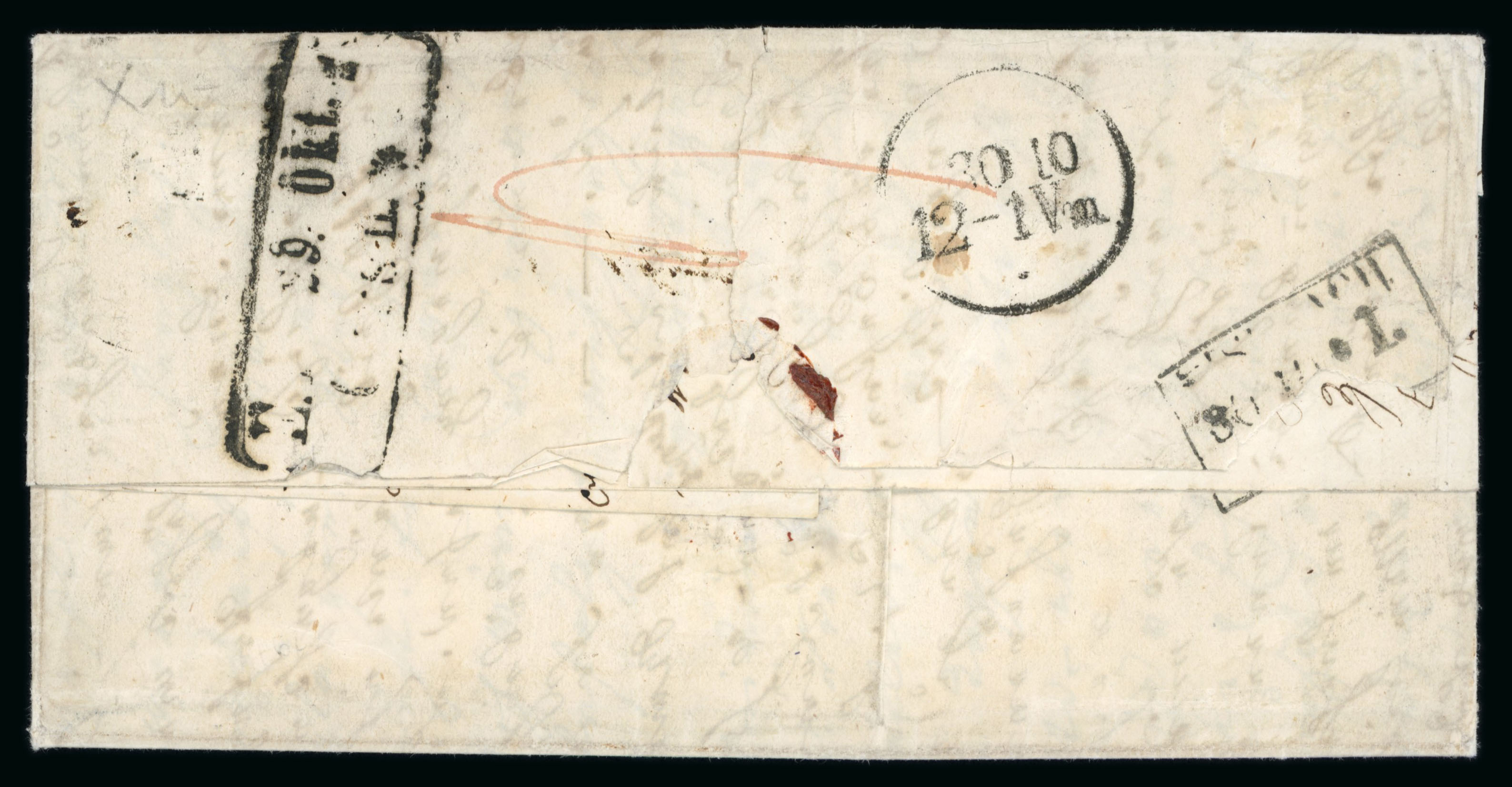 nebengesetzt « GENEVE 22 AOUT 55 6 S », sowie roter « SUISSE FERNEX 24 AOUT 55 » und schwarzes PD im Kreis von Genf. Vermutlich der einzige Schweizer Brief, der mit dem Krim-Krieg direkt in Verbindung steht. Atteste Rellstab 1996, Marchand 2024. (Image 1)