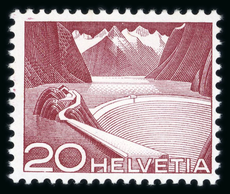 1949, 20 Rp. Grimsel Stausee in der seltenen Urtype, farbfrisch, allseits perfekt gezähnt, postfrisch mit vollem Originalgummi. Atteste Roumet 1993, Loertscher 2025. SBK = CHF 4000. (Image 1)