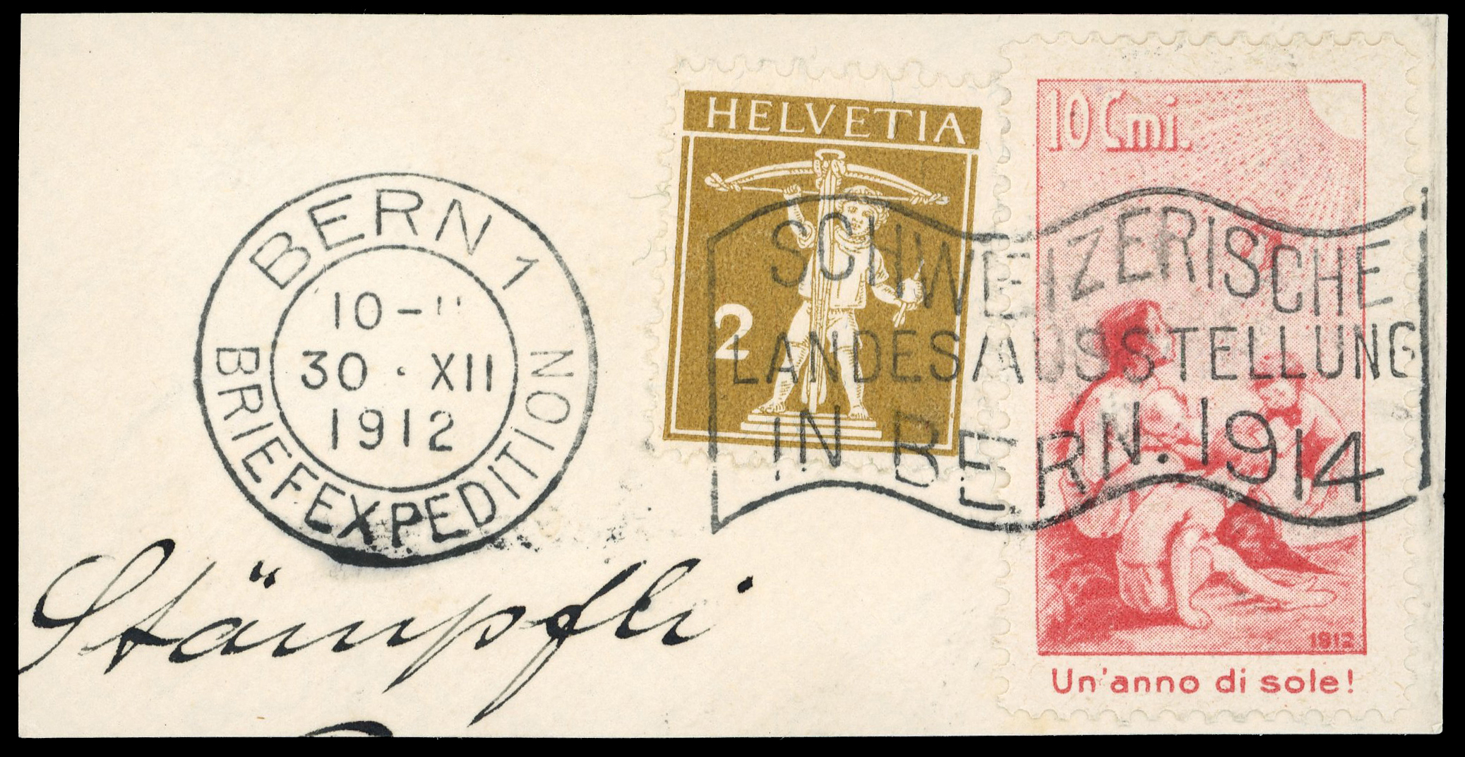 1912, Pro Juventute Vorläufer italienisch, zusammen mit Tellknabe 2 Rp. oliv, auf Briefstück, farbintensiv, allseits perfekt gezähnt, entwertet mit schwarzem Flaggenstempel « SCHWEIZERISCHE LANDESAUSSTELLUNG IN BERN 1914 » und