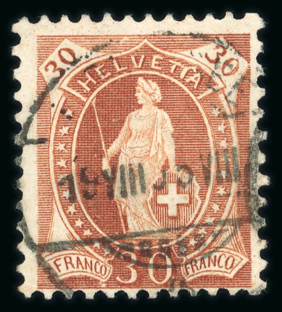 1904, Stehende Helvetia 30 Rp. braun, gezähnt 11½:11 mit Plattenfehler « HELVETTA », farbfrisch, allseits perfekt gezähnt, gestempelt « HERZOGENBUCHSEE 19 VIII 05 VIII ». Ein seltener Plattenfehler. Atteste Bossert 2003, Renggli 2008. SBK