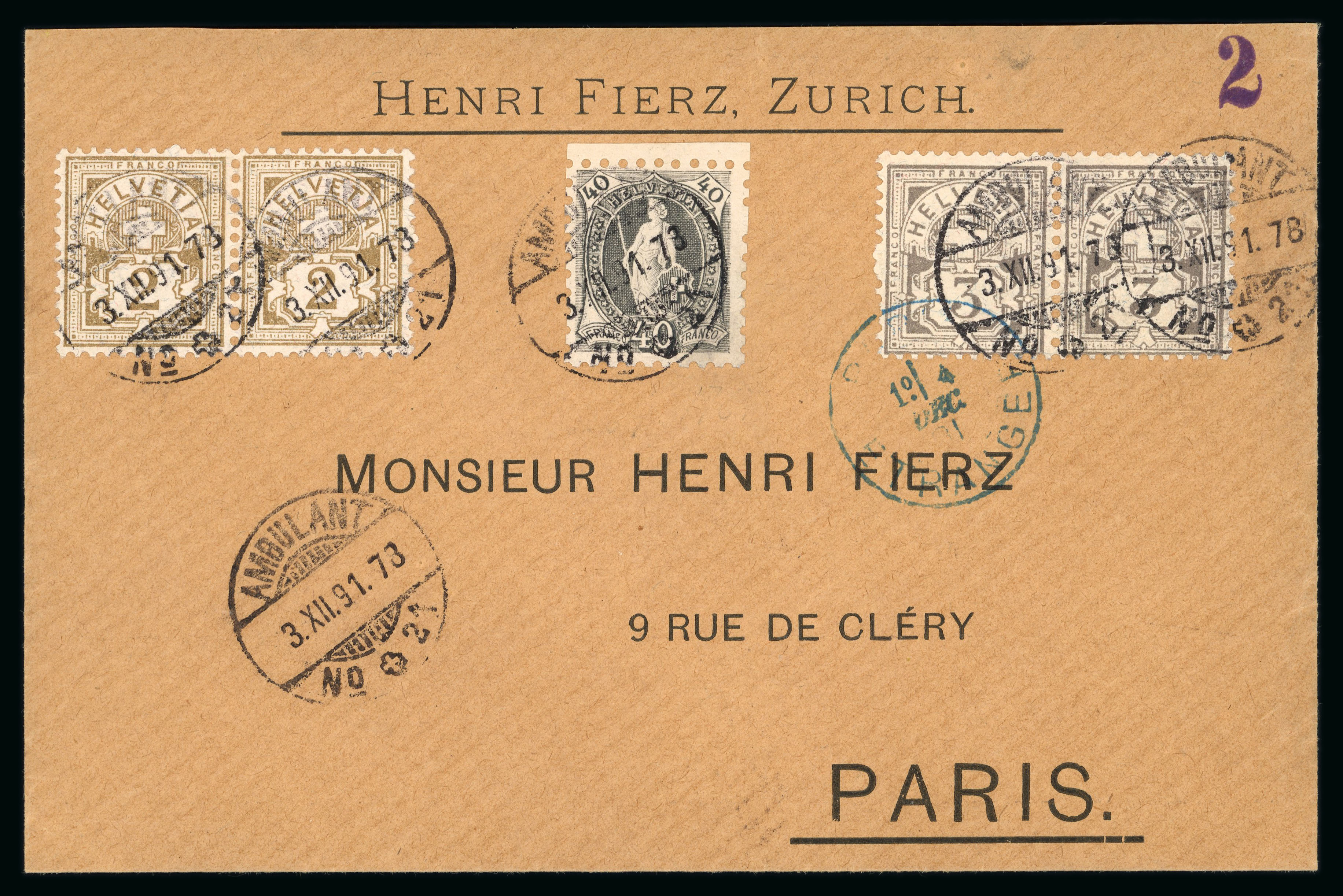 auf Brief nach Paris, je gestempelt « AMBULANT 3.XII.91. 73 NO 21 ». Die 40 Rp. der groben Zähnung, vor allem auf Brief und in tadelloser Erhaltung, ist von grösster Seltenheit und eine unterbewertete Rarität. Attest Renggli 1995. SBK = CHF 2400. (Image 1)