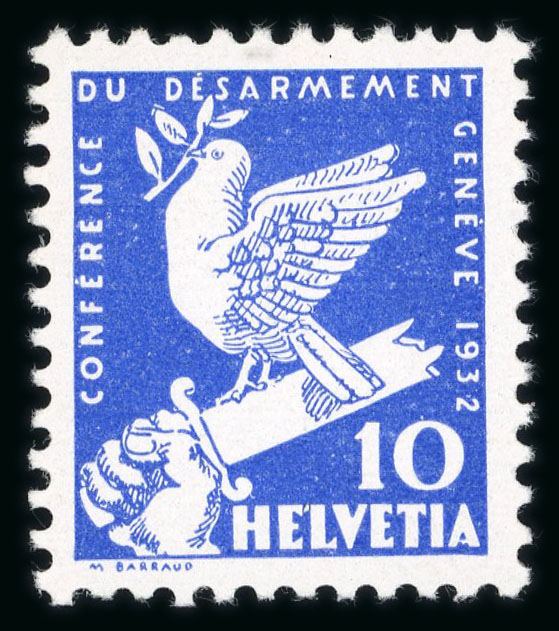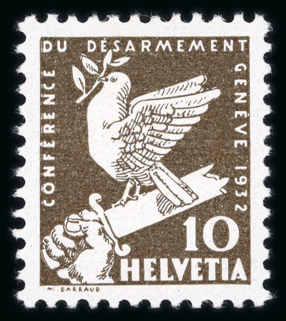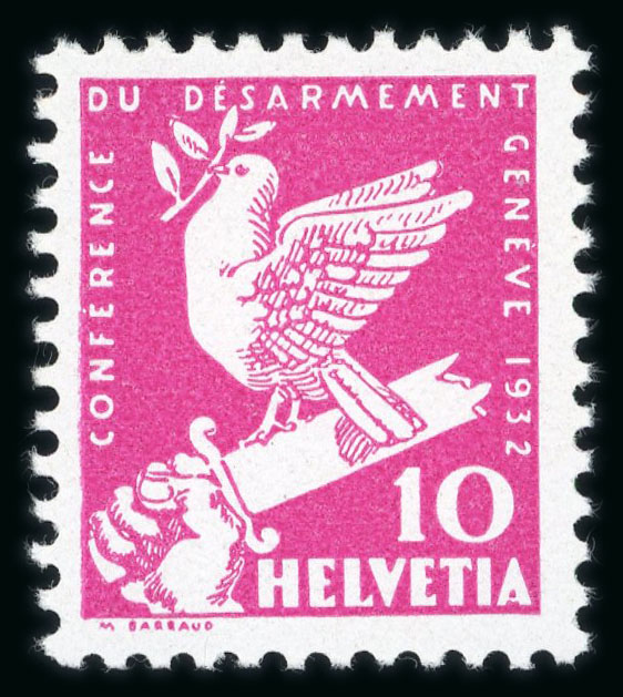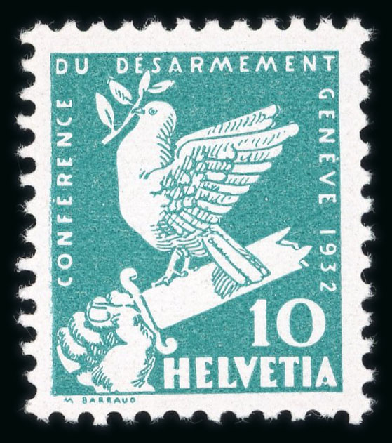 1932, Abrüstungskonferenz in Genf, 10 Rp., 4 unverausgabte Marken in den Farben der anderen Wertstufen, grün, lilarot, blau und braun, alle Werte mit perfekter Zähnung, ungebraucht mit vollem Originalgummi, postfrisch. Ein sehr seltener