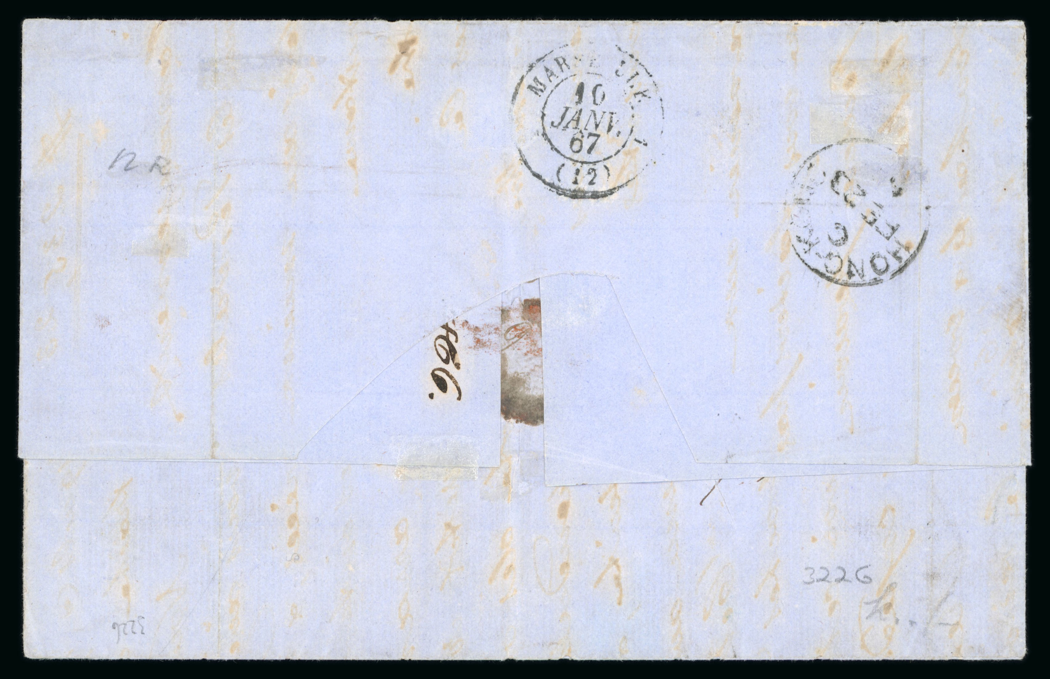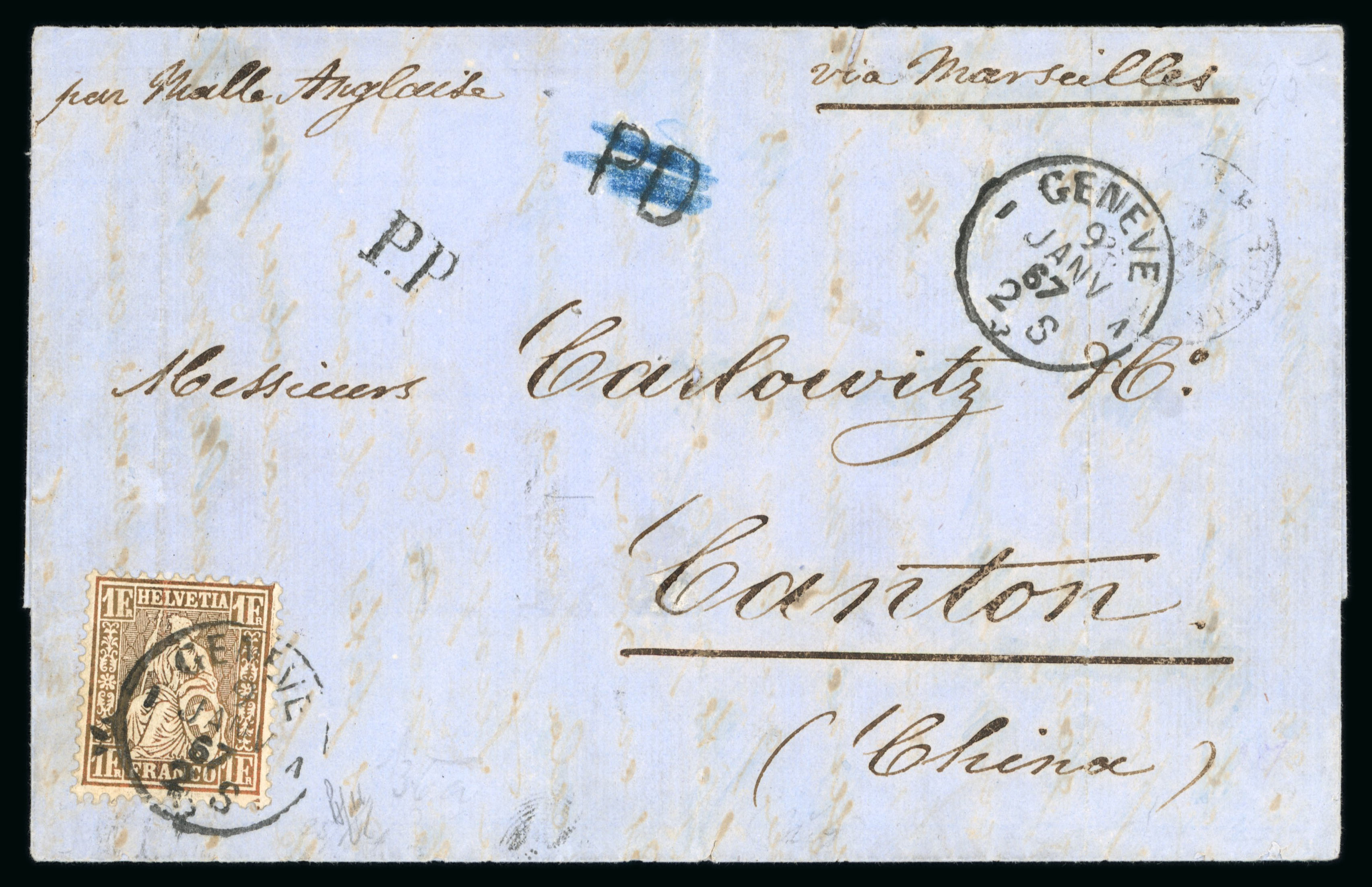 durchgestrichen und durch PP ersetzt, sowie französischer Grenzübergangsstempel, rückseitig Transitstempel Marseille und Hong Kong. Eine portogerechte Frankatur für einen einfachen Brief nach China. Die Einzelfrankaturen sind viel seltener als die