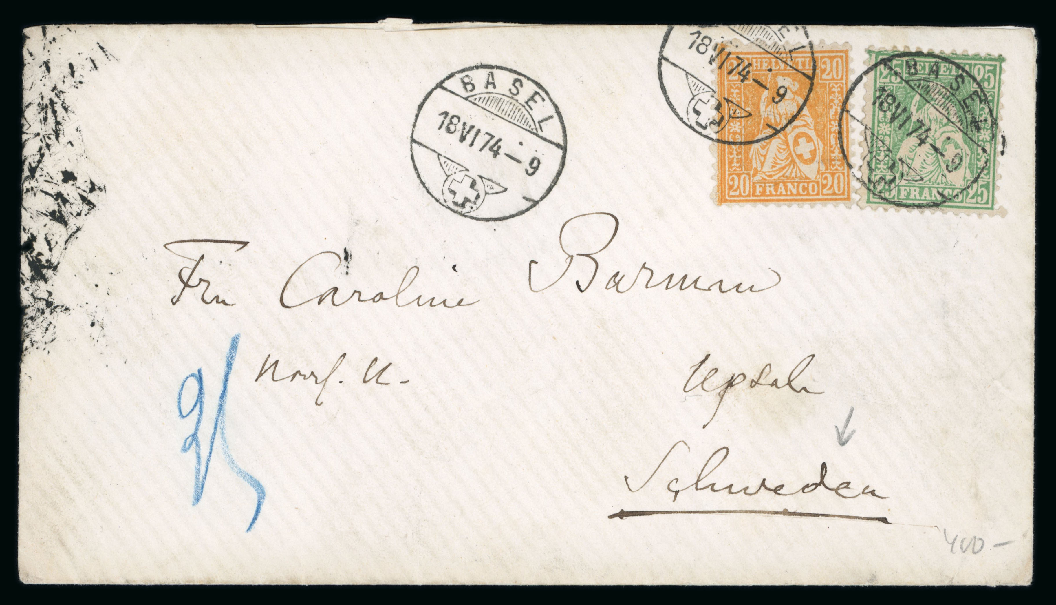 1874, 20 Rp. orange zusammen mit 25 Rp. grün, allseits sehr gut gezähnt, auf Brief von Basel nach Upsala (Schweden), übergehend entwertet mit schwarzem Stempel « BASEL 18 VI 74 -9 » und nebengesetzt wiederholt, rückseitig Ankunftsstempel.