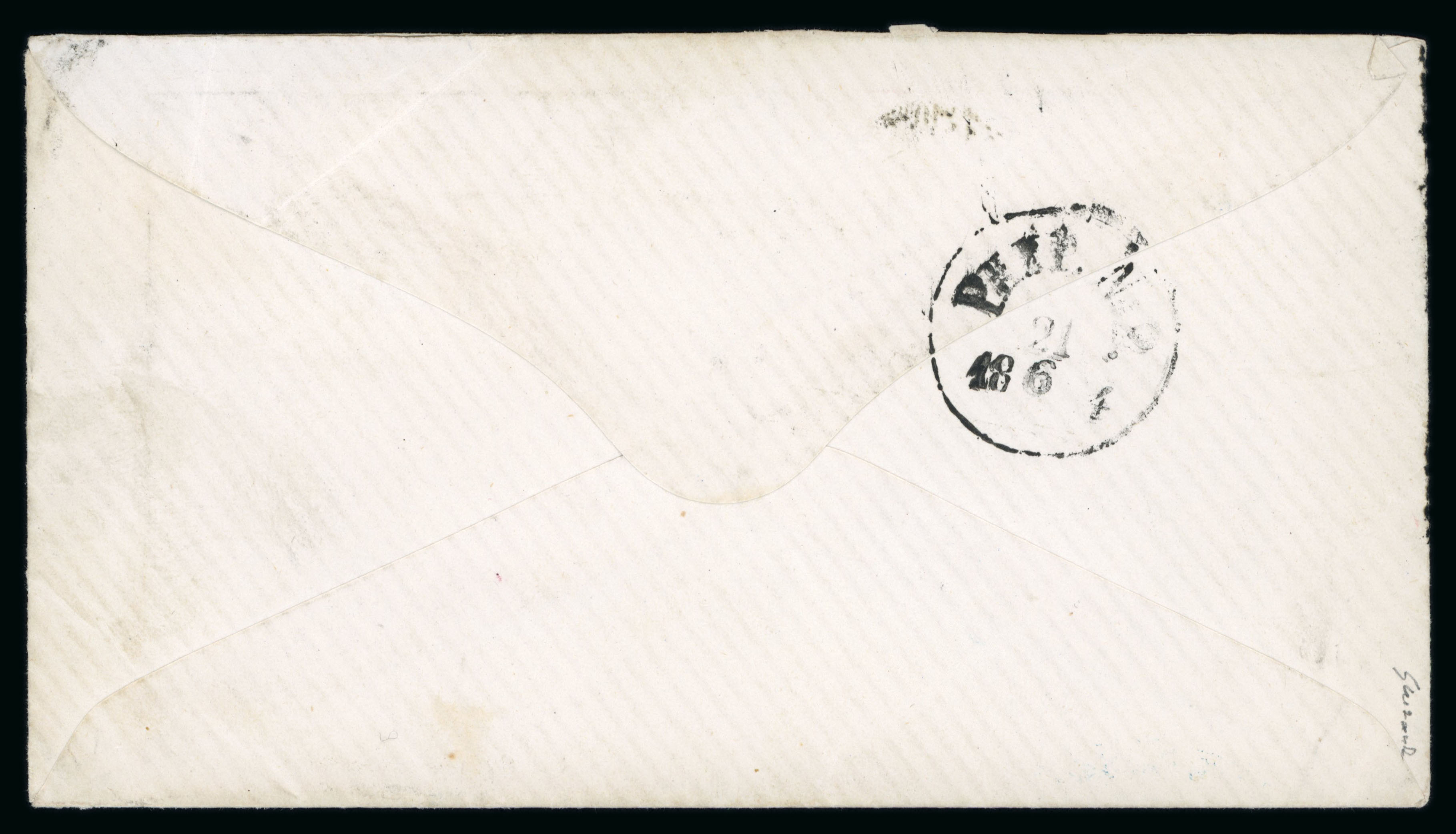 1867, 1 Fr. goldbronze rötlich, farbfrisch, allseits einwandfrei gezähnt, senkrechter Registraturbug, kleines Risschen beim 6. Zahn, auf Brief von Genf nach Canton, China, entwertet « GENEVE 9 JANV 67 2S » und nebengesetzt wiederholt, PD