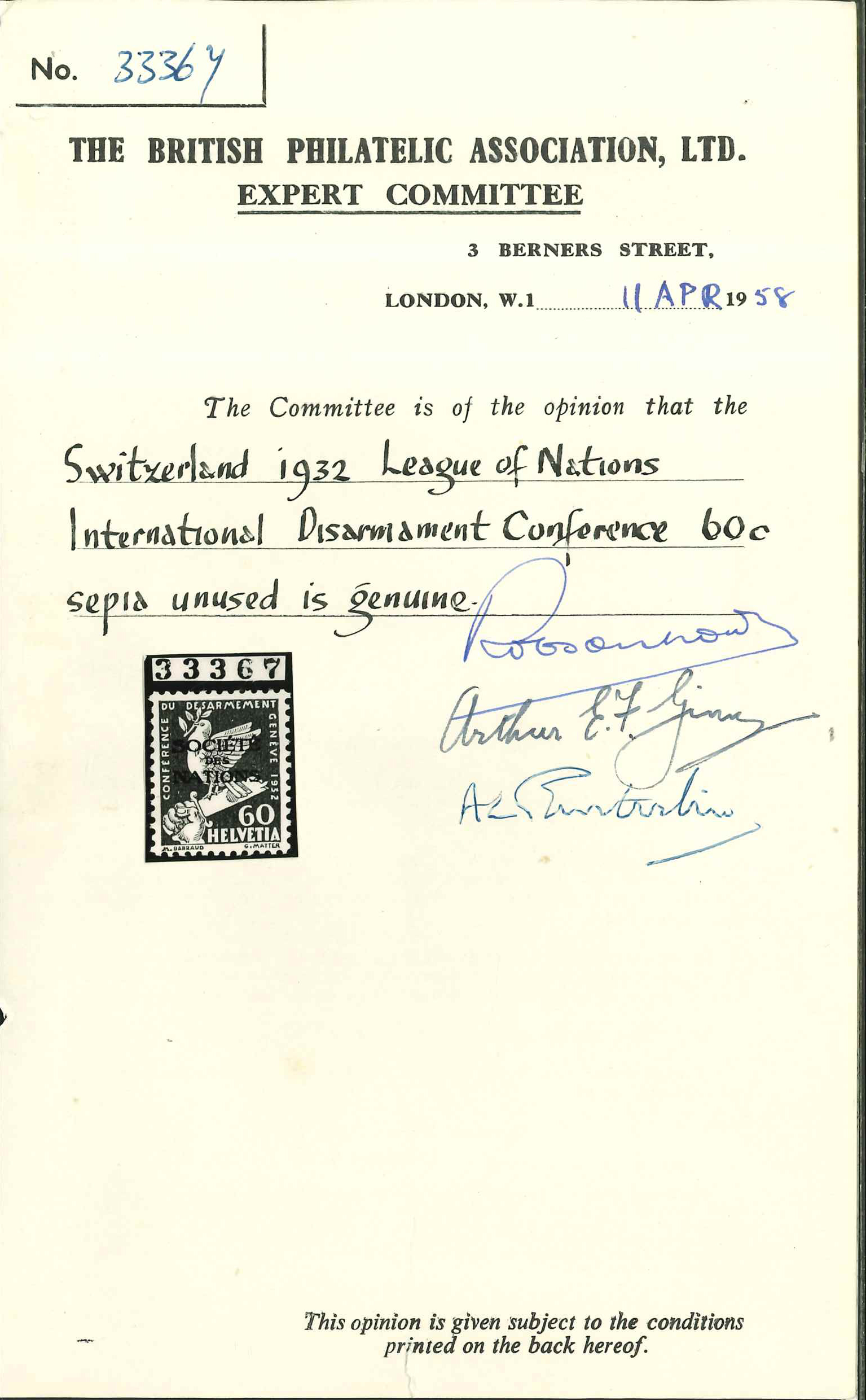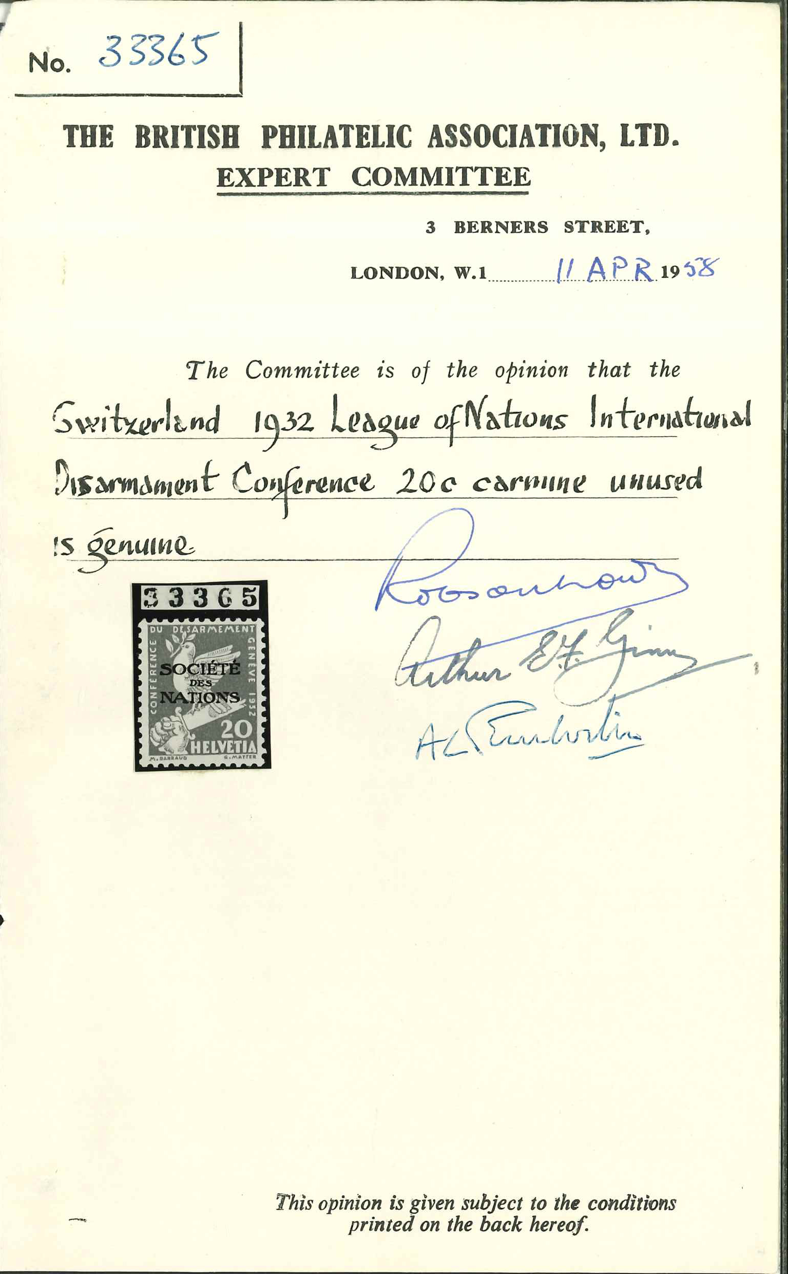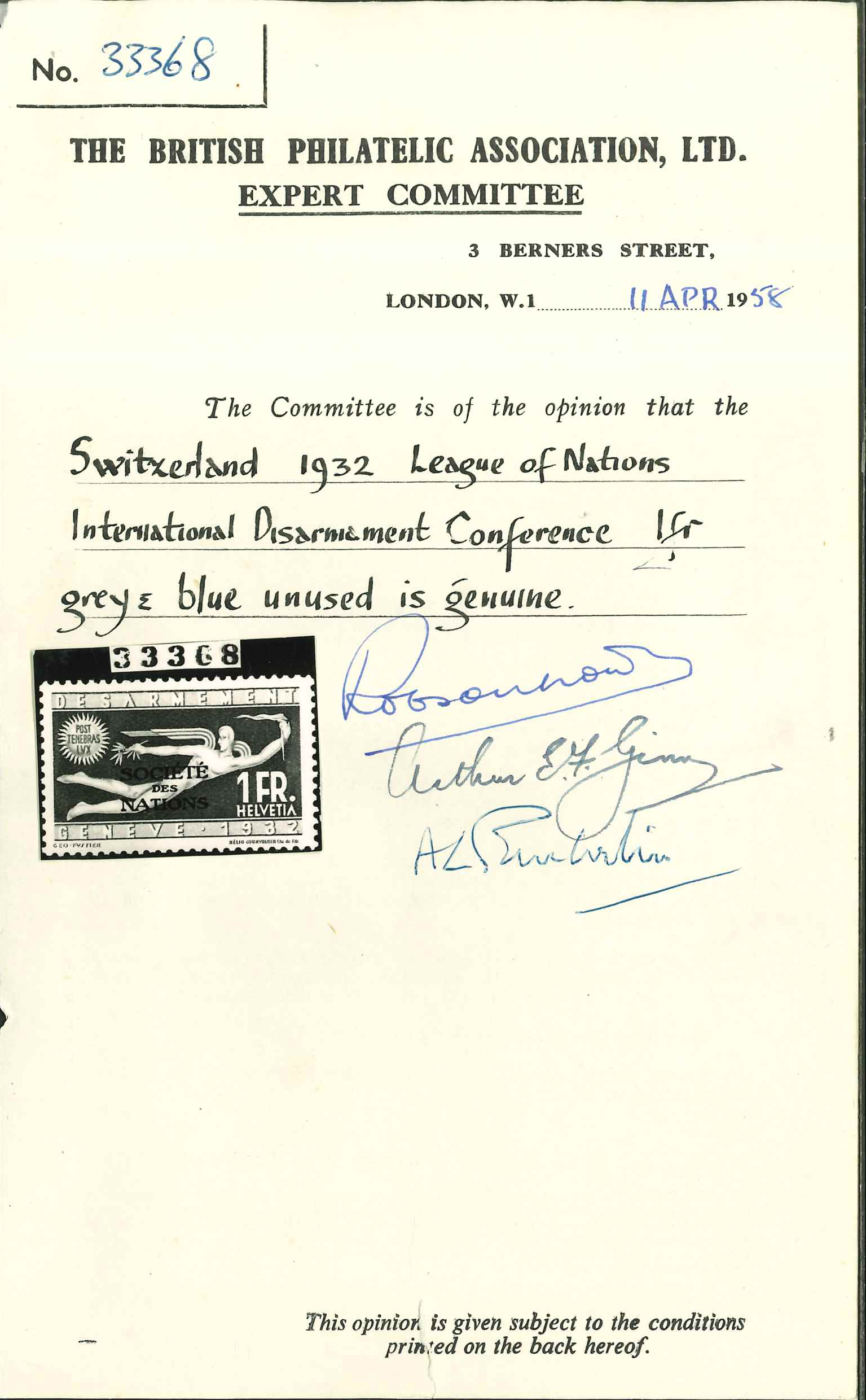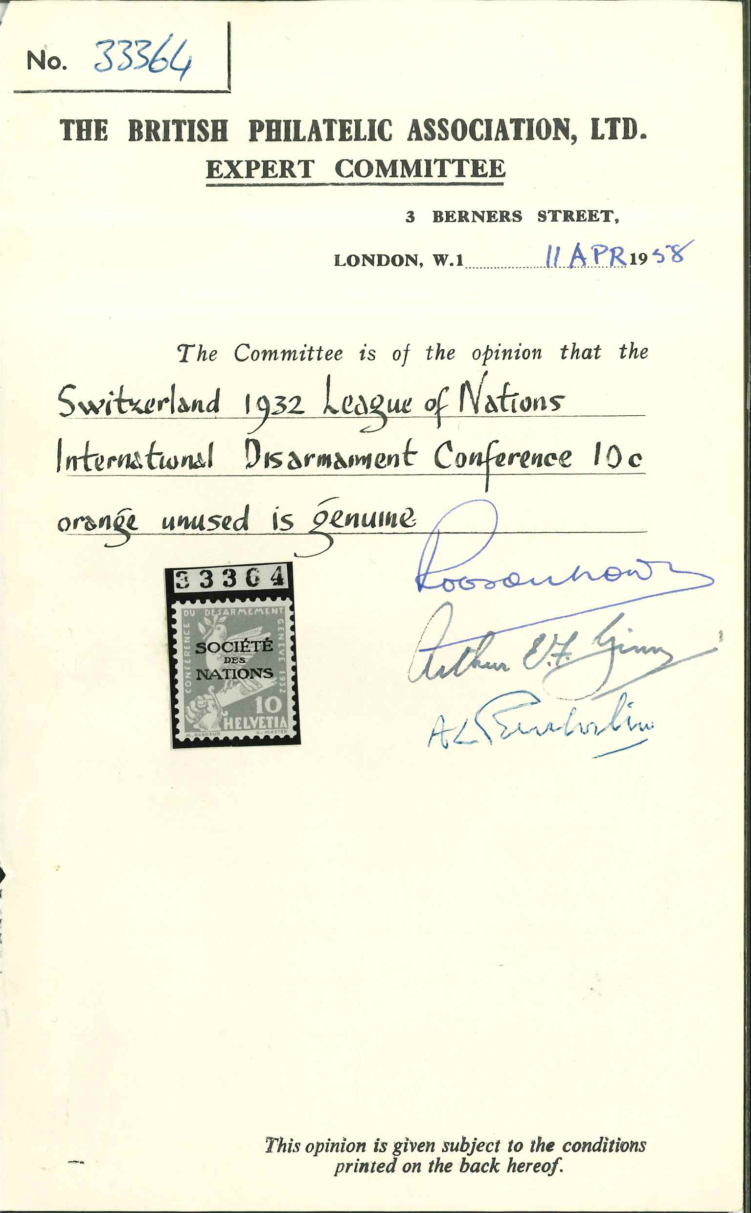 1932 Völkerbund / Société des Nations Gedenkmarken zur Abrüstungskonferenz in Genf, ungebrauchter Satz mit Originalgummi, der durch Feuchtigkeit in Mitleidenschaft gezogen wurde. Jede Marke mit BPA Attest von 1958 (diese u.a signiert von