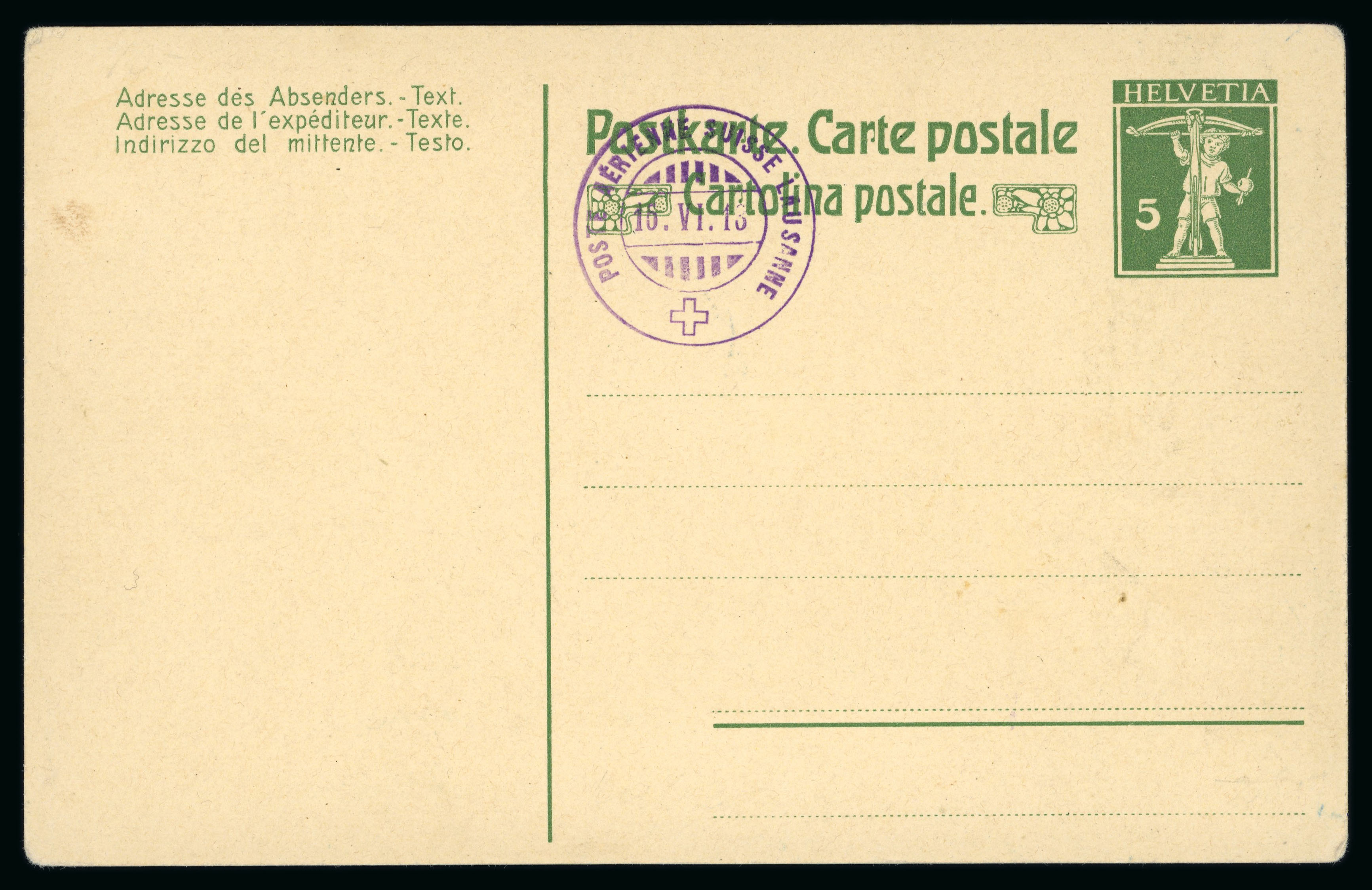 1913, Zwischensteg mit Tellknabe 5 Rp. grün Type II, allseits perfekt gezähnt, auf Brief nach Bern, entwertet mit grossem Flaggenstempel « SCHWEIZERISCHE LANDESAUSSTELLUNG IN BERN 1914 » und « BERN 9-10 23.VII 1913 ». Ein seltener Brief.