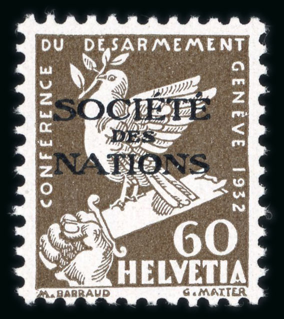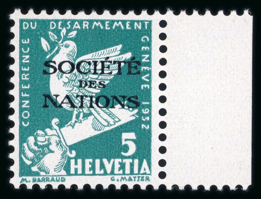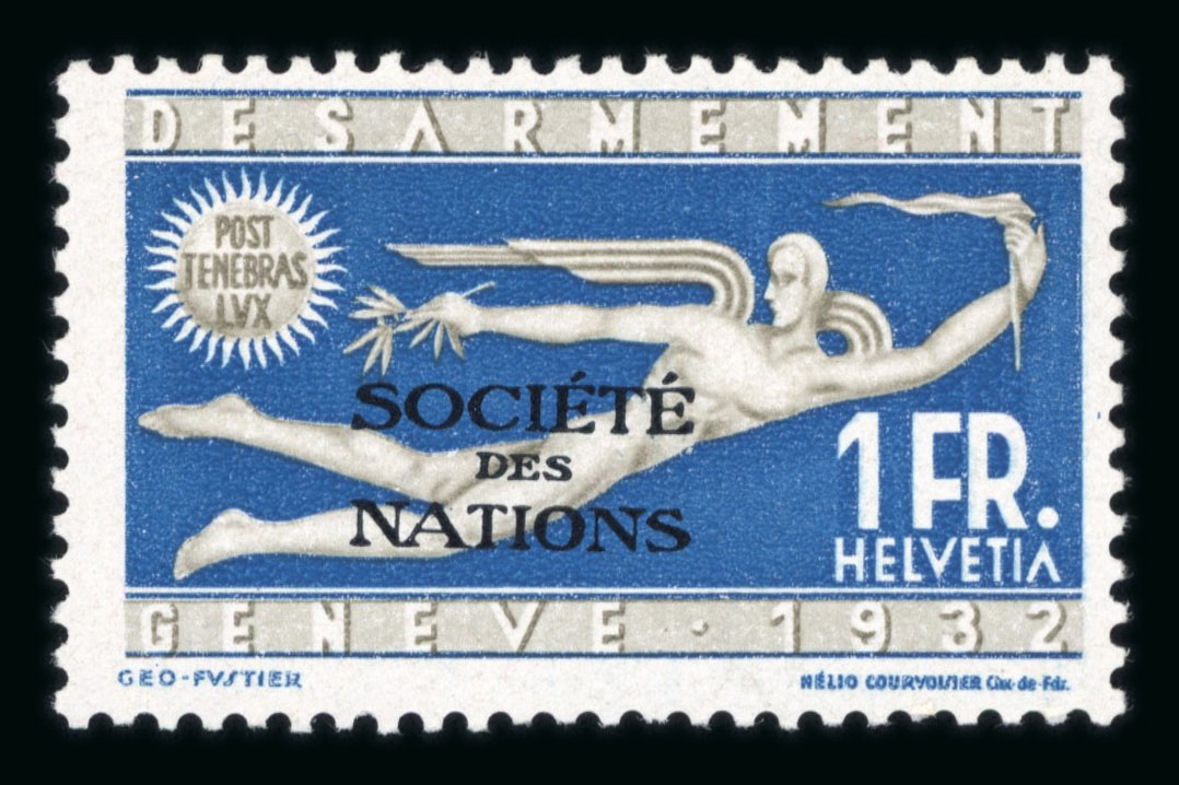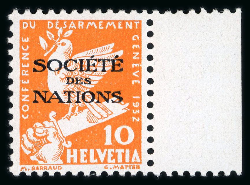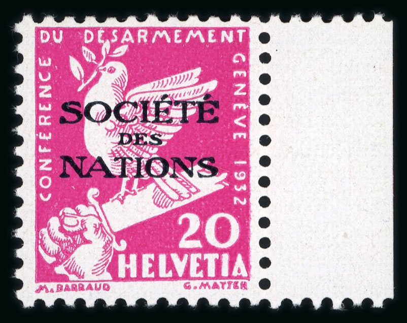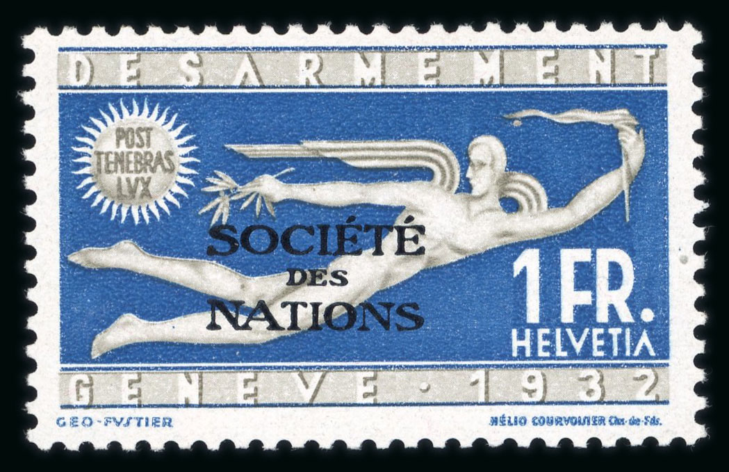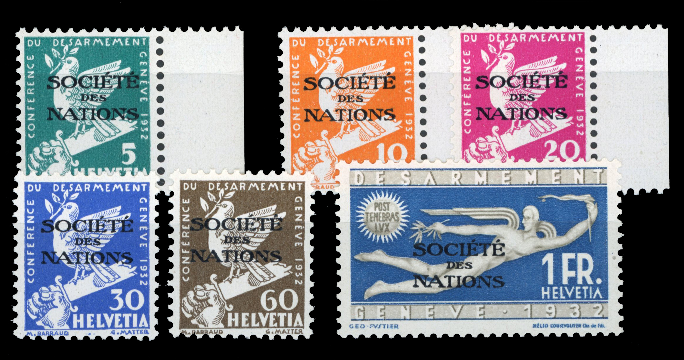 1932, Société des Nations Abrüstungskonferenz, kompletter Satz der 6 Werte von 5 Rp. bis 1 Fr., tadellos gezähnt, 5, 10 und 20 Rp. mit linkem Bogenrand, ungebraucht mit vollem Originalgummi, postfrisch. Attest Bach 2024. SBK = CHF 5400.