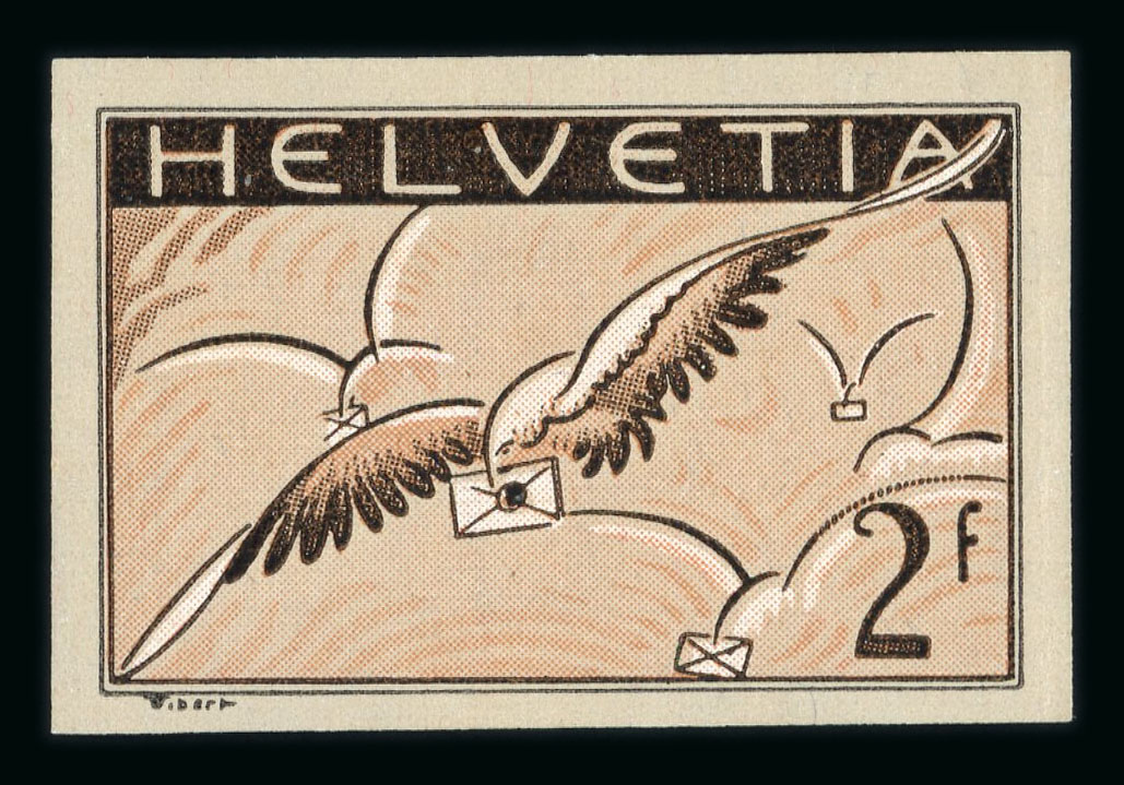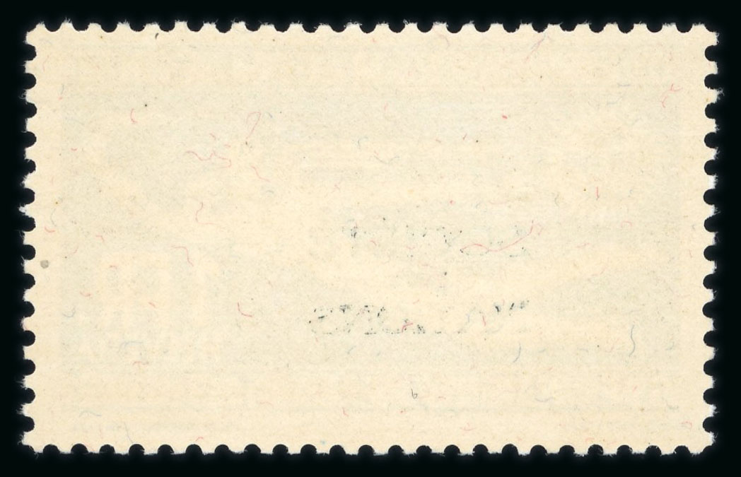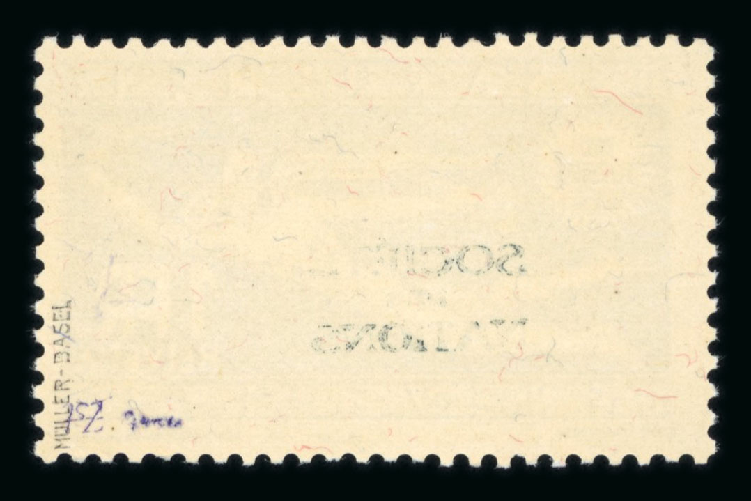 Flugpost 2 Fr., auf geriffeltem Faserpapier mit Abart ungezähnt, sehr farbfrisch, allseits breitrandig geschnitten, ungebraucht mit vollem Originalgummi und Falz. Es sind lediglich 25 Exemplare von dieser seltenen Abart bekannt. Signiert