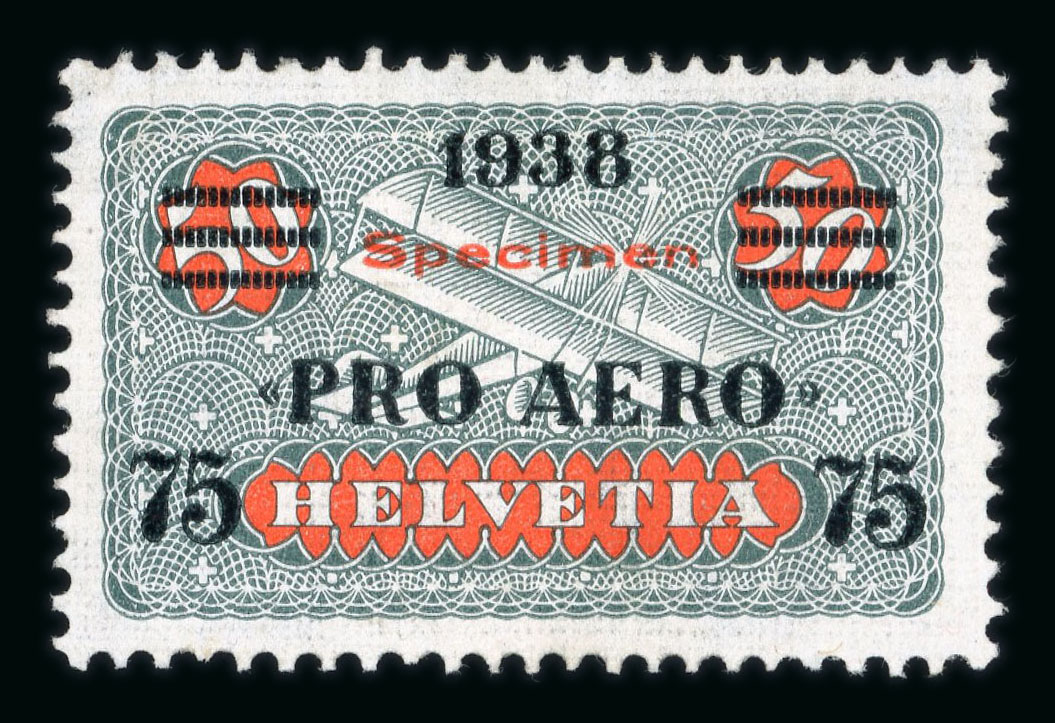 1938, Pro Aero 75 auf 50 Rp. mit rotem Aufdruck « Specimen », farbfrisch, allseits perfekt gezähnt, ungebraucht mit vollem Originalgummi und Falz. SBK = CHF 1500. (Image 1)