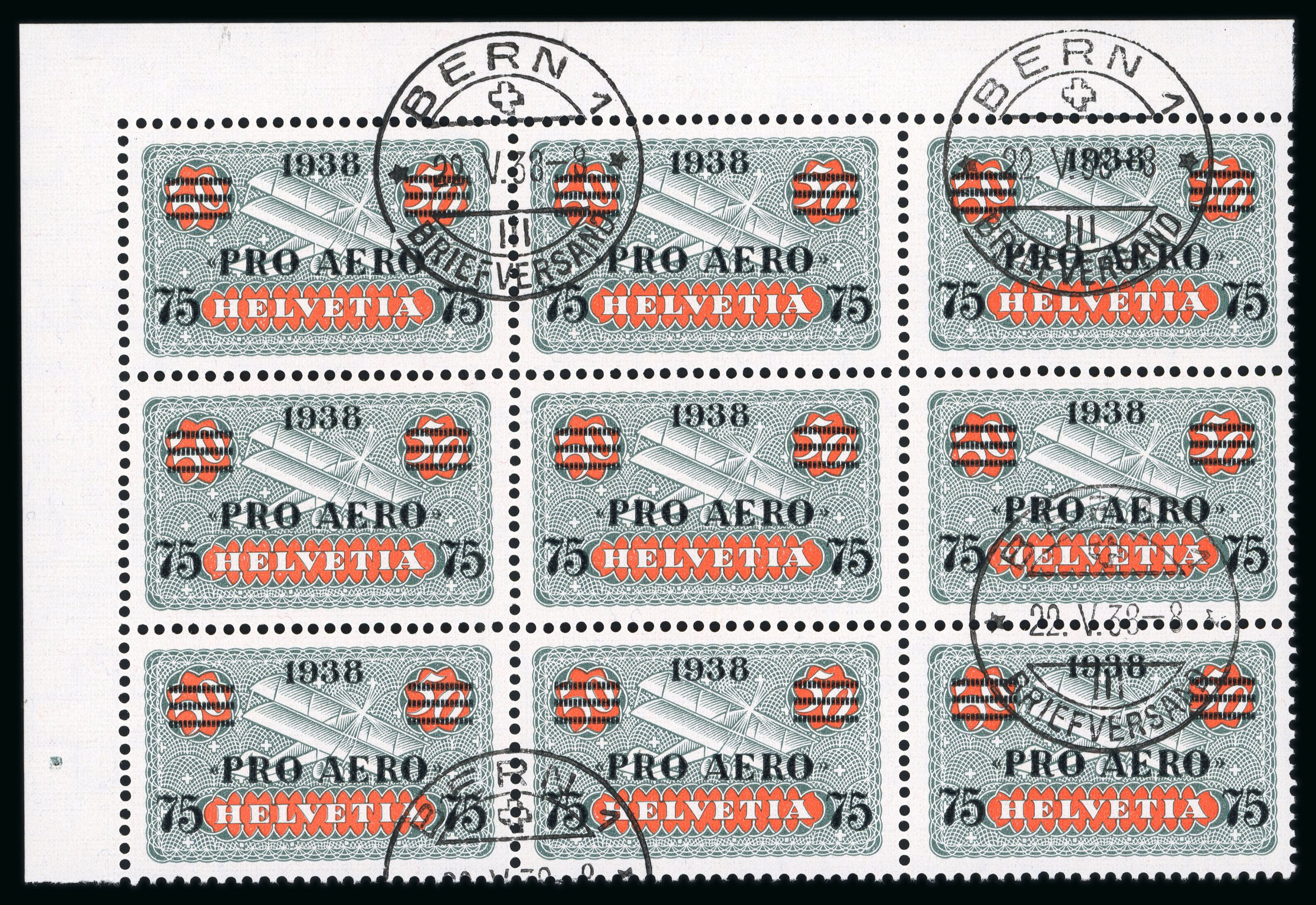 1938, Flugpost 75 auf 50 Rp. mit Aufdruck Pro Aero, im 9er Block aus der linken oberen Bogenecke. Bei der Entwertung mit dem Stempel « BERN 1 22.V.38-8 BRIEFVERSAND » sind 2 Marken ungestempelt und damit postfrisch geblieben. Ein