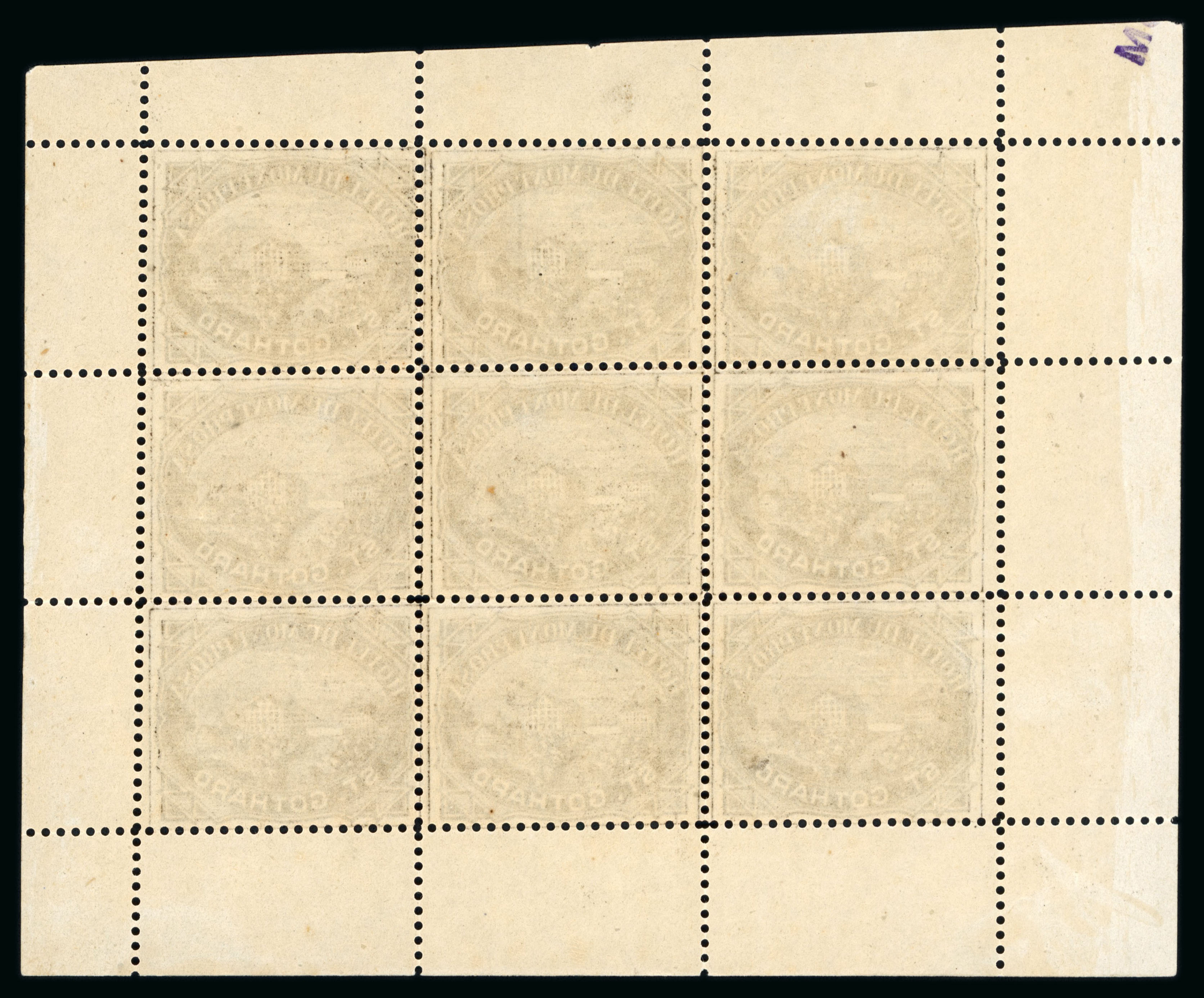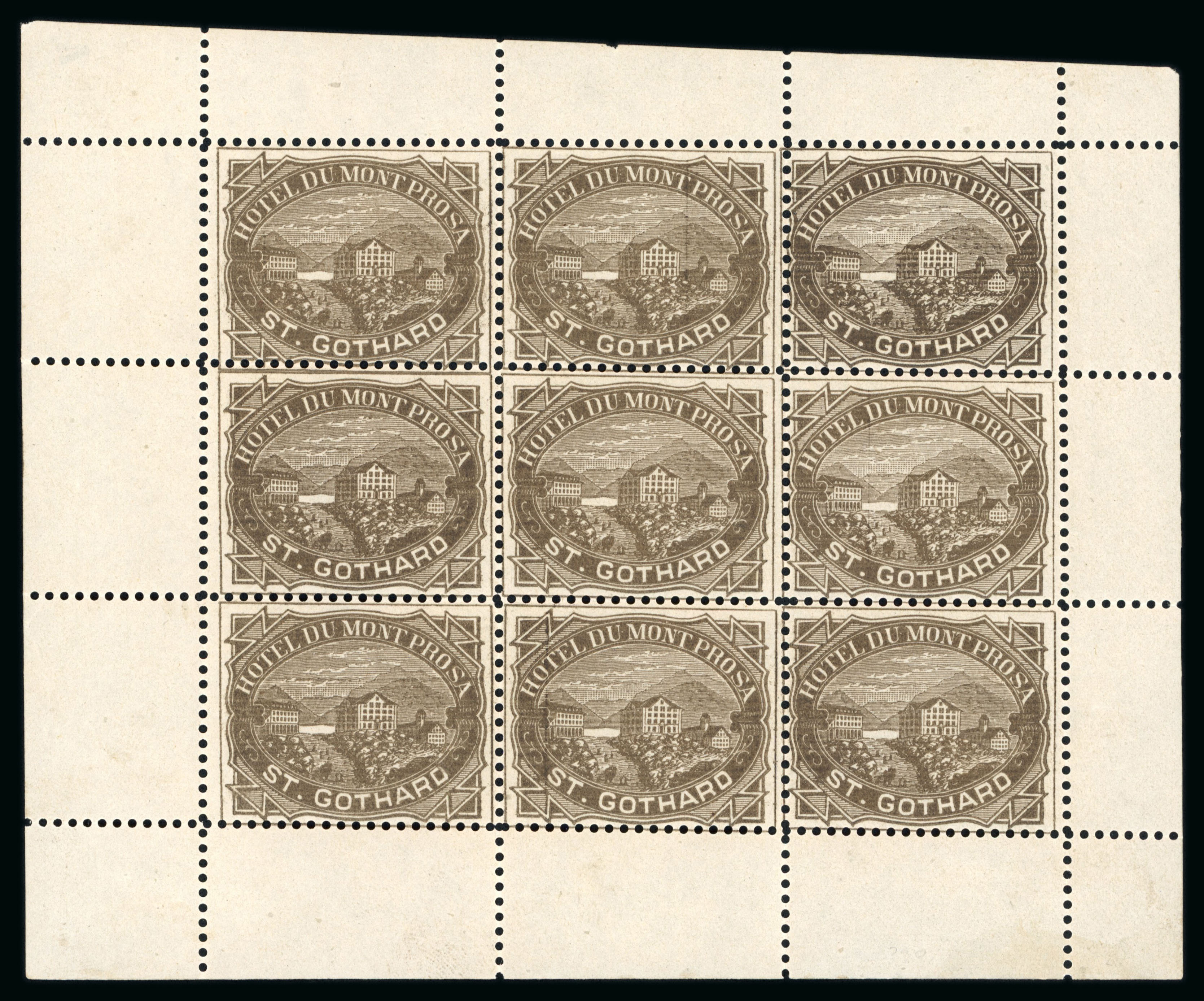 Hotelpost, « Hotel du Mont Prosa, St. Gothard » im Kleinbogen von 9 Marken mit Rändern, alle tadellos postfrisch. Eine grosse und eindrucksvolle Rarität, wovon nur etwa 10 Stück bekannt sind. Attest Marchand 2025. (Image 1)