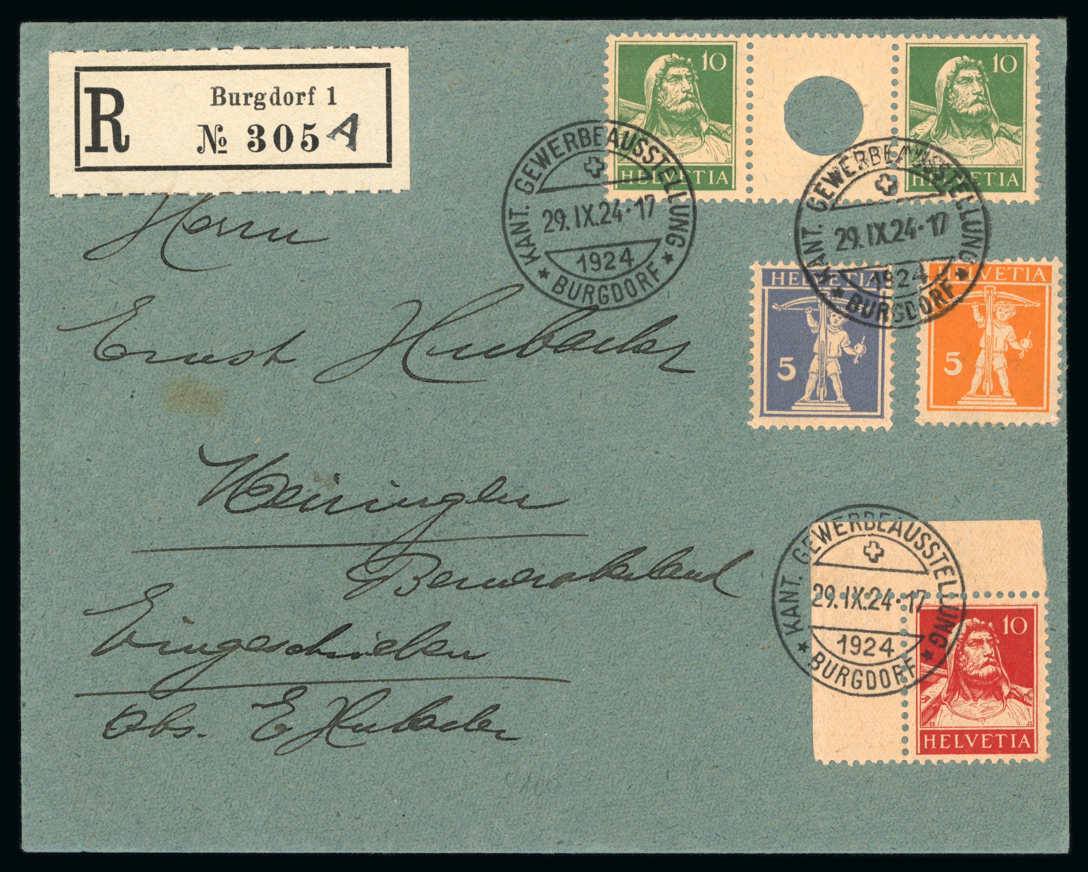 1924, Zwischensteg mit Tellbrust 10 Rp. grün sämisch und Zusatzfrankatur, alle Marken mit perfekter Zähnung, auf Brief von Burgdorf nach Meiningen, gestempelt « KANT. GEWERBEAUSSTELLUNG 1924 BURGDORF 29.IX.24-17 ». Eine dekorative,