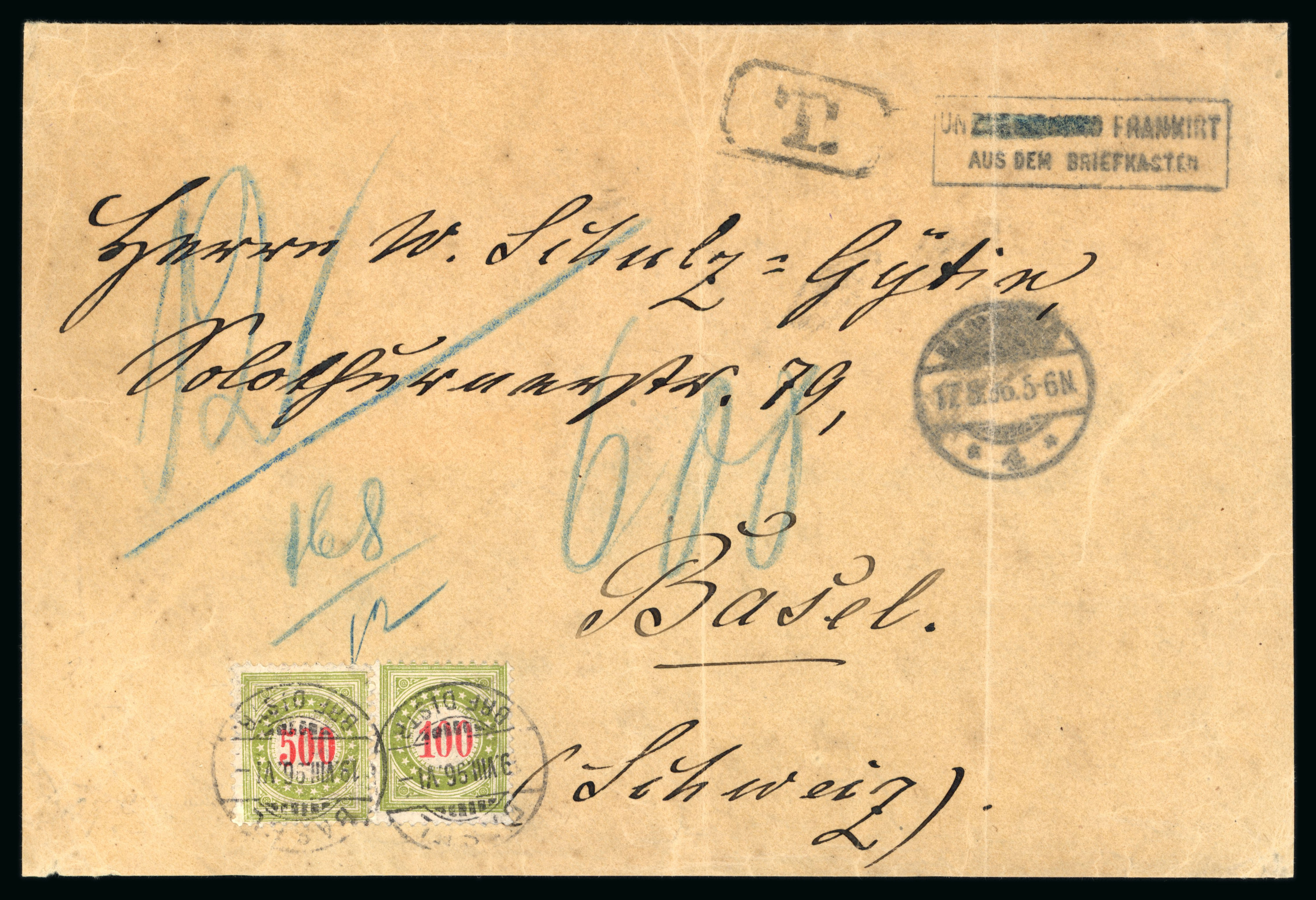 gezähnt auf Brief von Hamburg nach Basel, gestempelt « BASEL BRF. DIRSTR. 19.VIII.95.VI ». Eine sehr seltene Verwendung der 500 Rp. als Portomarke; sie wurde meistens nur als Freimarke verwendet. Bei weitem eine der seltensten Schweizer Marken auf