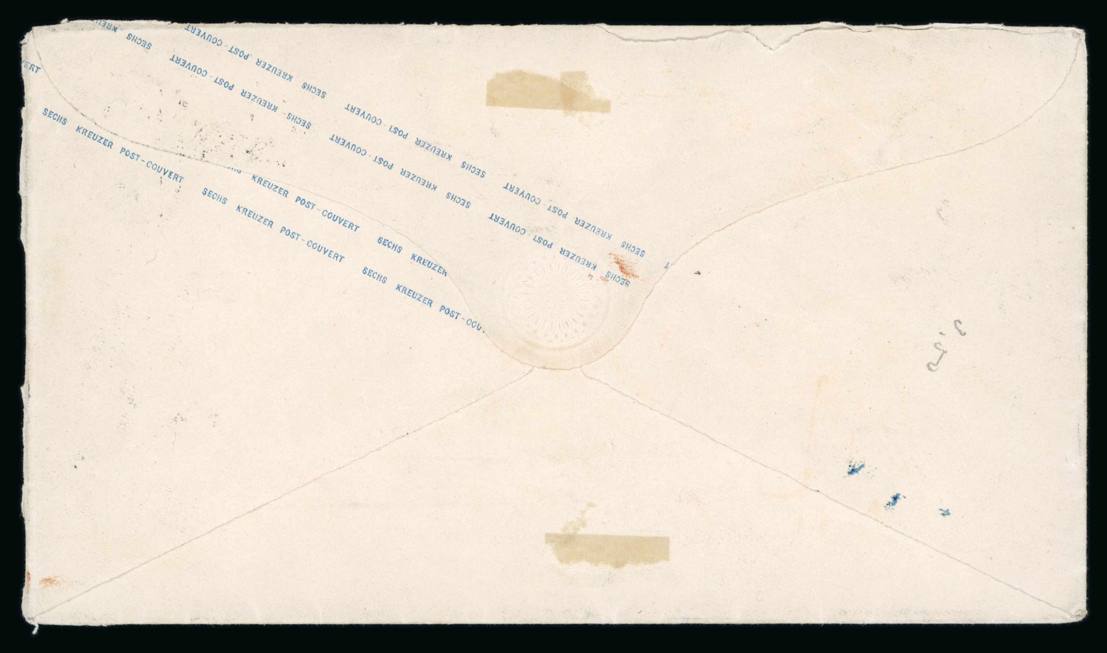 1863 Rigi-Kaltbad Hotelpost Taxe von 15 Rappen auf eingehendem Brief von Frankfurt am Main. Der Thurn und Taxis Ganzsachen-Umschlag von 6 Kreuzer blau trägt die Zusatzfrankatur einer 6 Kreuzer Briefmarke, gestempelt mit dem Nummernstempel