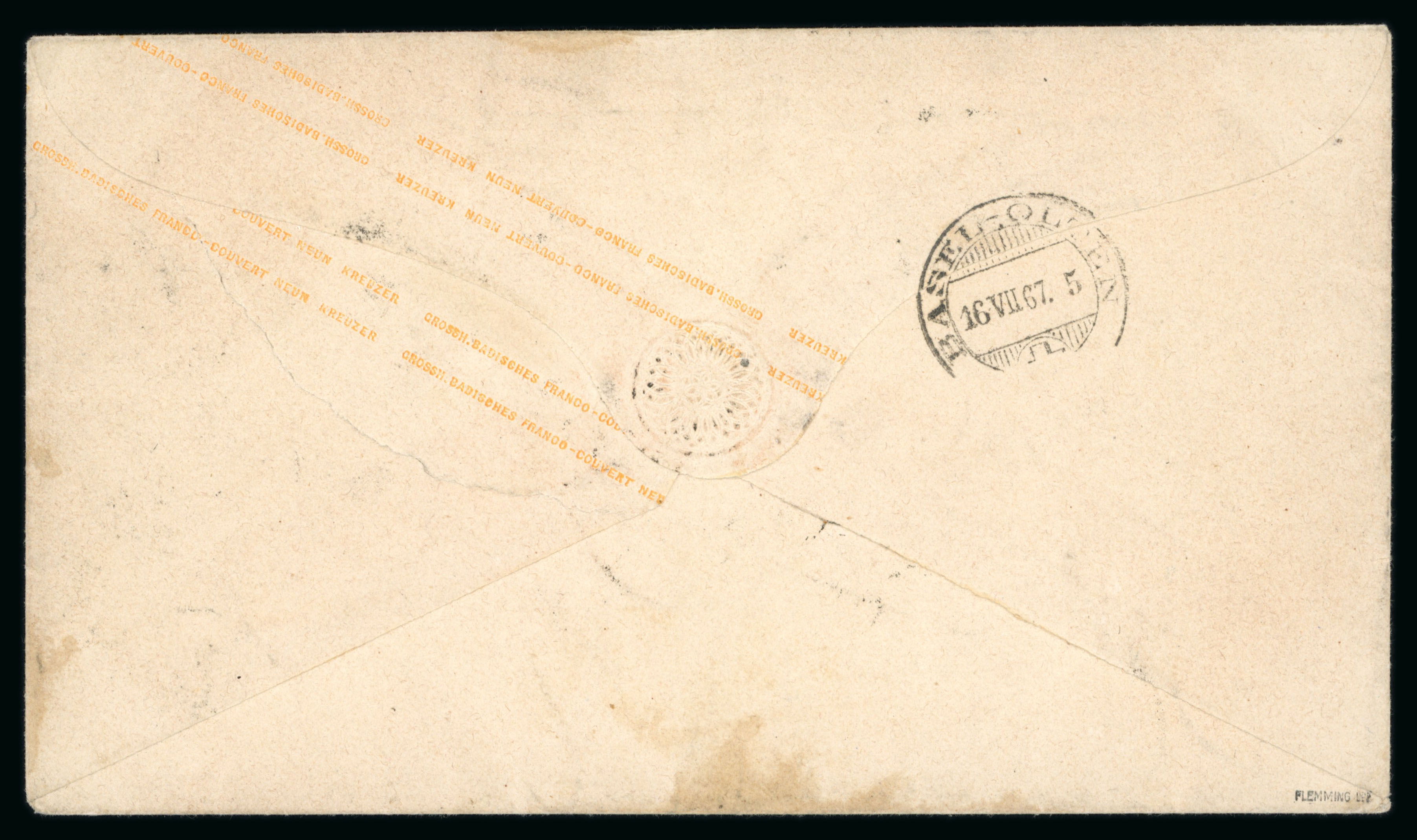 1867 Rigi-Scheideck Hotelpost auf eingehendem Brief von Karlsruhe. Der Baden Ganzsachen-Umschlag von 9 Kreuzer braun trägt die Zusatzfrankatur einer 3 Kreuzer Briefmarke, gestempelt mit dem Zweikreisstempel « CARLSRUHE 15 JUL » und ist