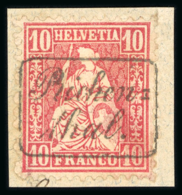 50398 ,O,,   1862-78, Fingerhutstempel: riesige Ansammlung Fingerhutstempel auf 33 Steckkarten, mit Werten von 2 Rp. bis zu 60 Rp., mit Einheiten bis zu Viererstreifen. Eine unzählige Anzahl an seltenen Stempeln in schwarz, blau und violett, welche teilweise im Abstempelungsbuch nicht aufgeführt sind, wie zum Beispiel « DAMVAUT », « COUCHAPOIX » oder erst kürzlich entdeckt wurden wie « ALLE ». Ferner viele Exemplare des seltenen Stempels « CORBAN », auch im seltenen Violett. Viele Nuancen und bessere Marken sind vorhanden. Eine genaue Beschreibung dieser einmaligen Ansammlung ist unmöglich. Wir empfehlen deshalb allen Interessenten eine Besichtigung. (Image 1)