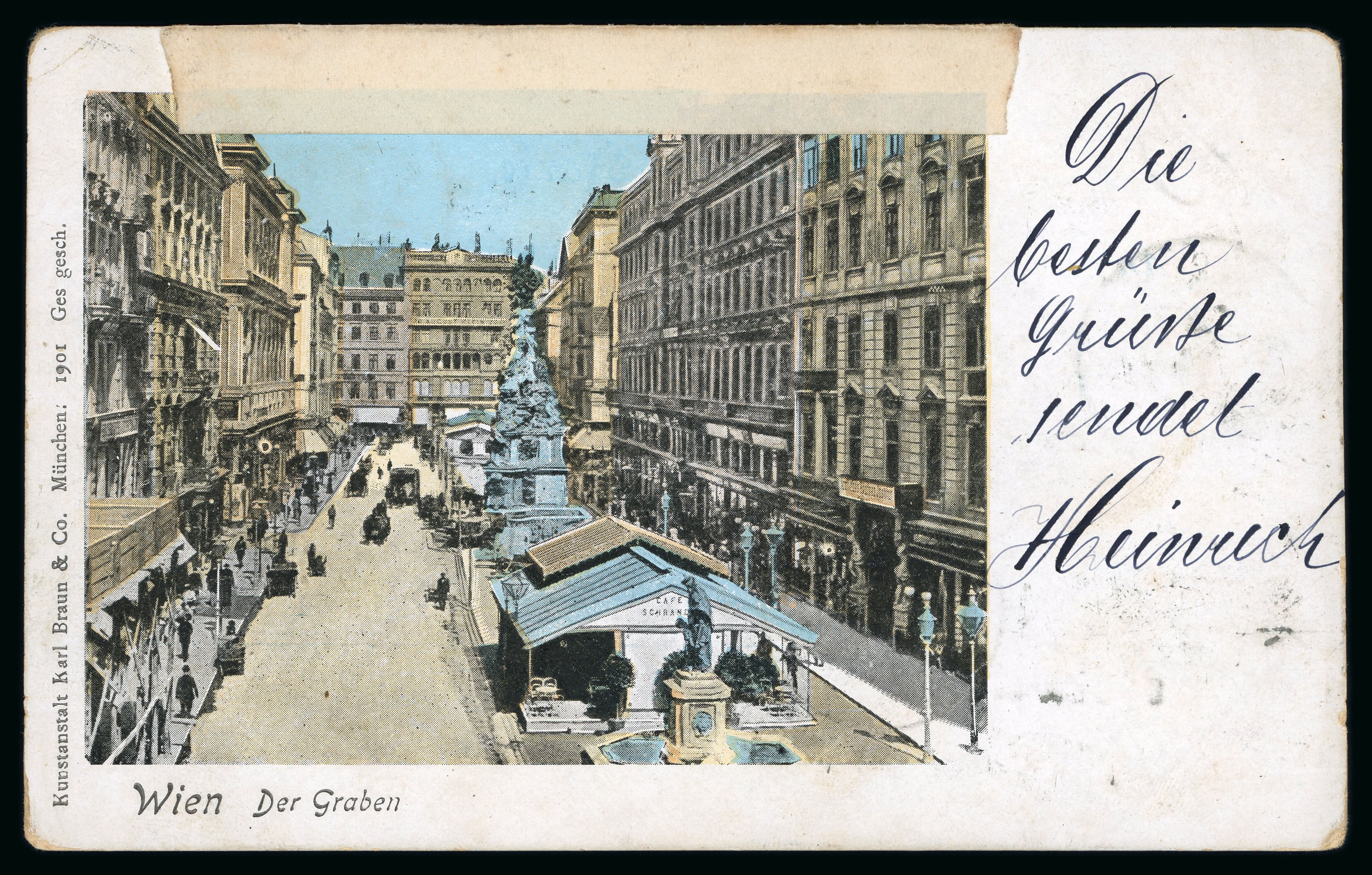 Portomarken auf zwei seltenen Briefen 1901-1902 aus dem Ausland mit verschiedenen WEITERSPEDITIONS-ZETTEL Formularen der schweizer Post und Portomarken: 1) Ansichtskarte aus Wien 1901 als Drucksache frankiert, jedoch mit handschriftlichem