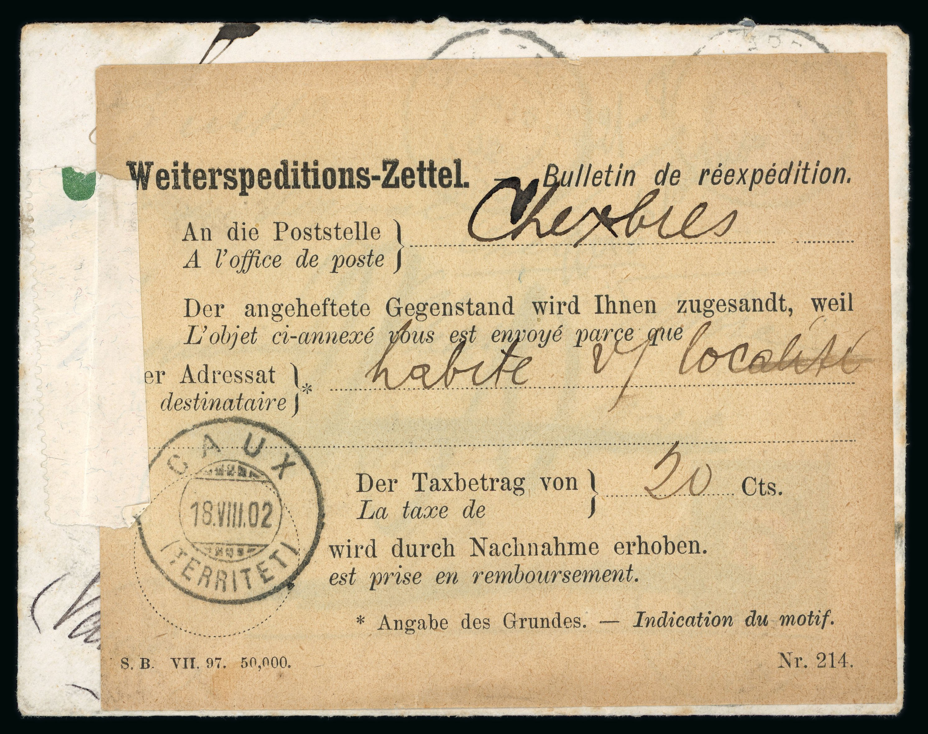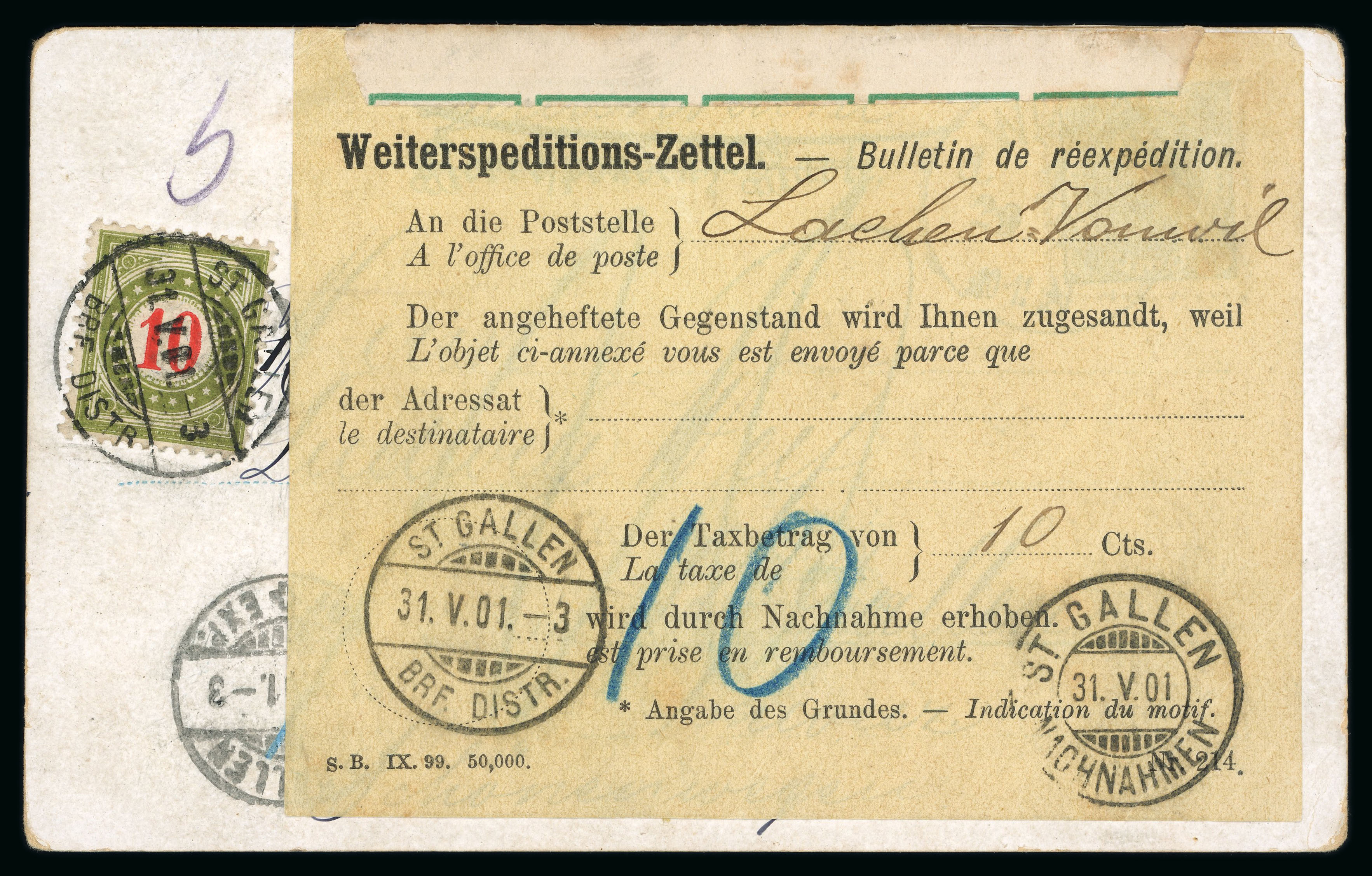 Text, nach St. Gallen gesendet und dort entsprechend mit 10 Rp. Portomarke taxiert und mit dem seltenen WEITERSPEDITIONS-ZETTEL der Auflage 9.99 versehen; 2) Brief aus Frankreich 1902 mit der Mouchon Ausgabe, gestempelt im Departement Gard, an das