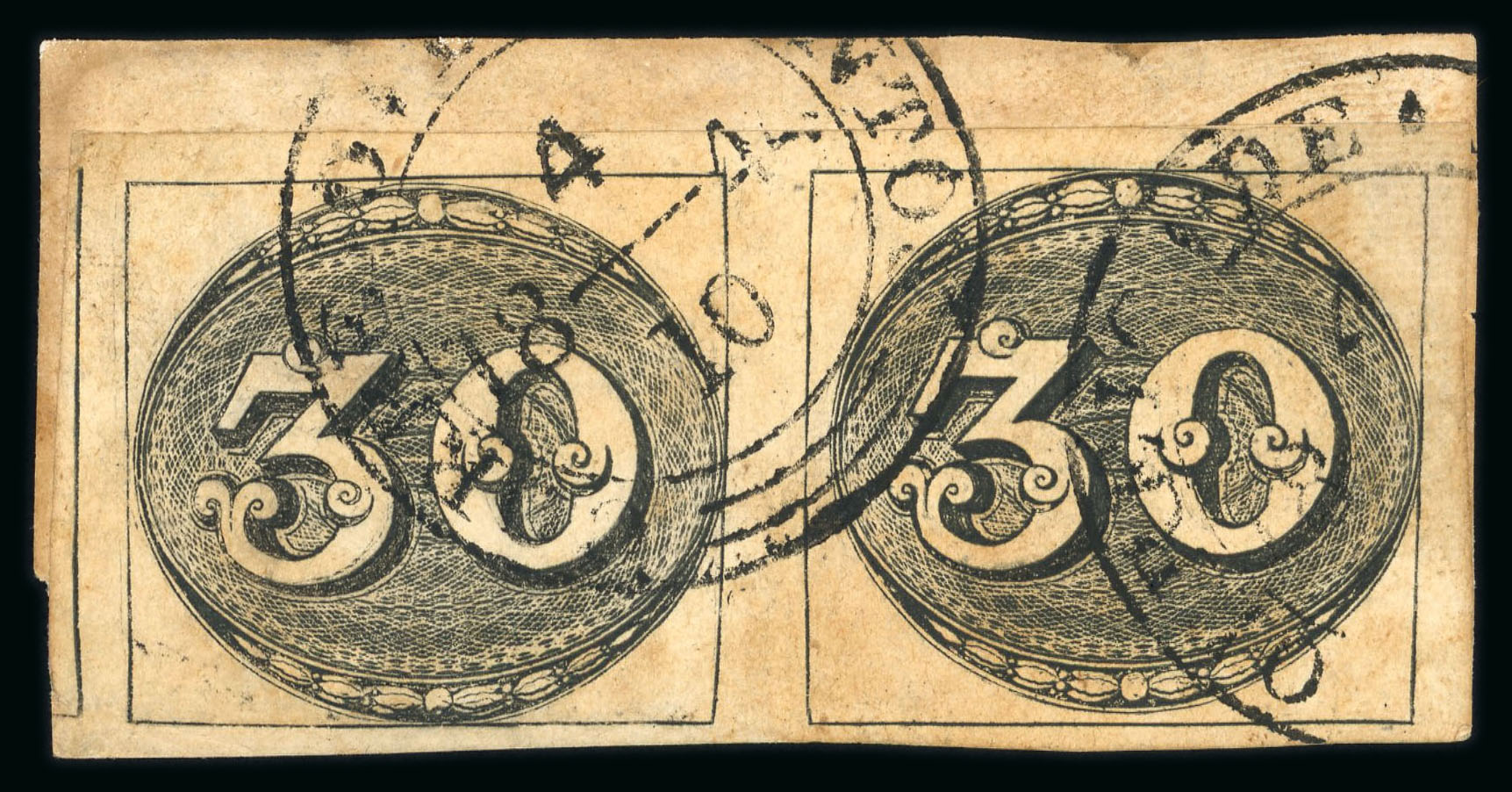 1843 30r early impression horizontal pair on piece, close to large margins tied part cancels with toning to stamps and piece. (Image 1)