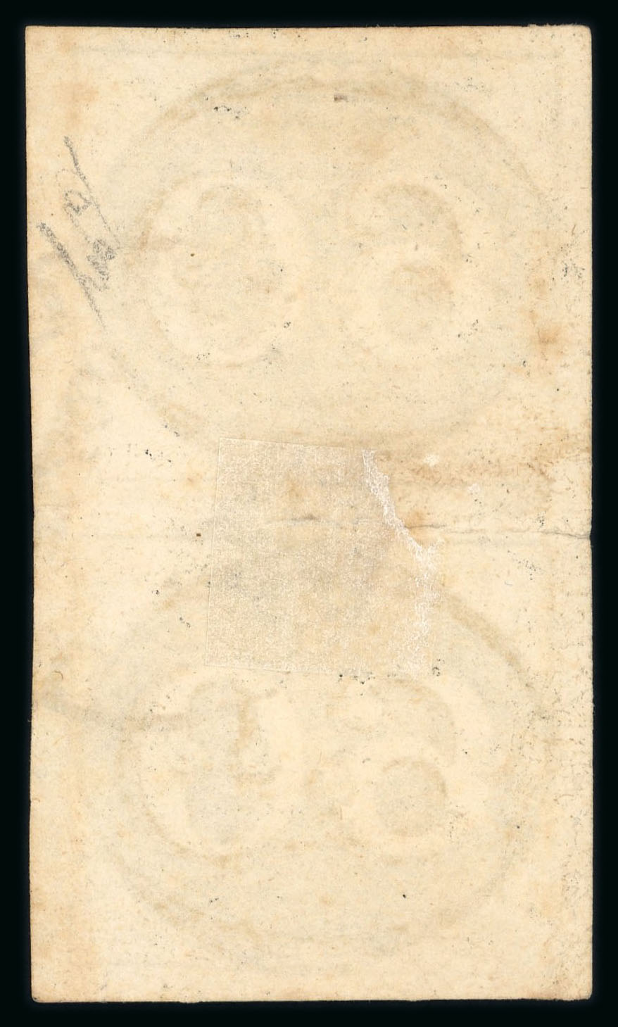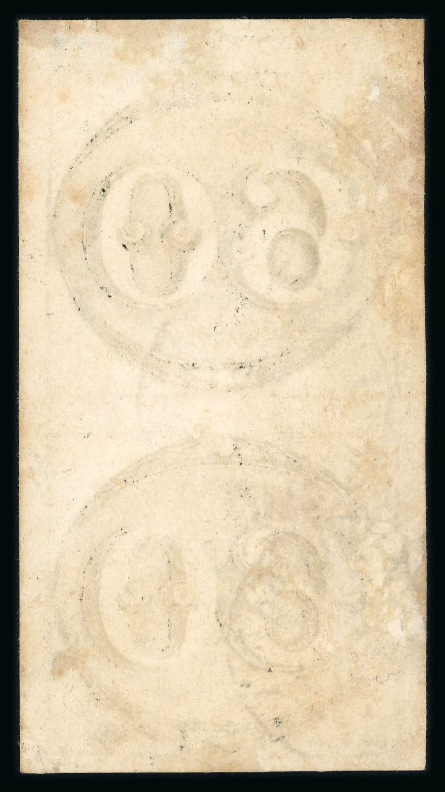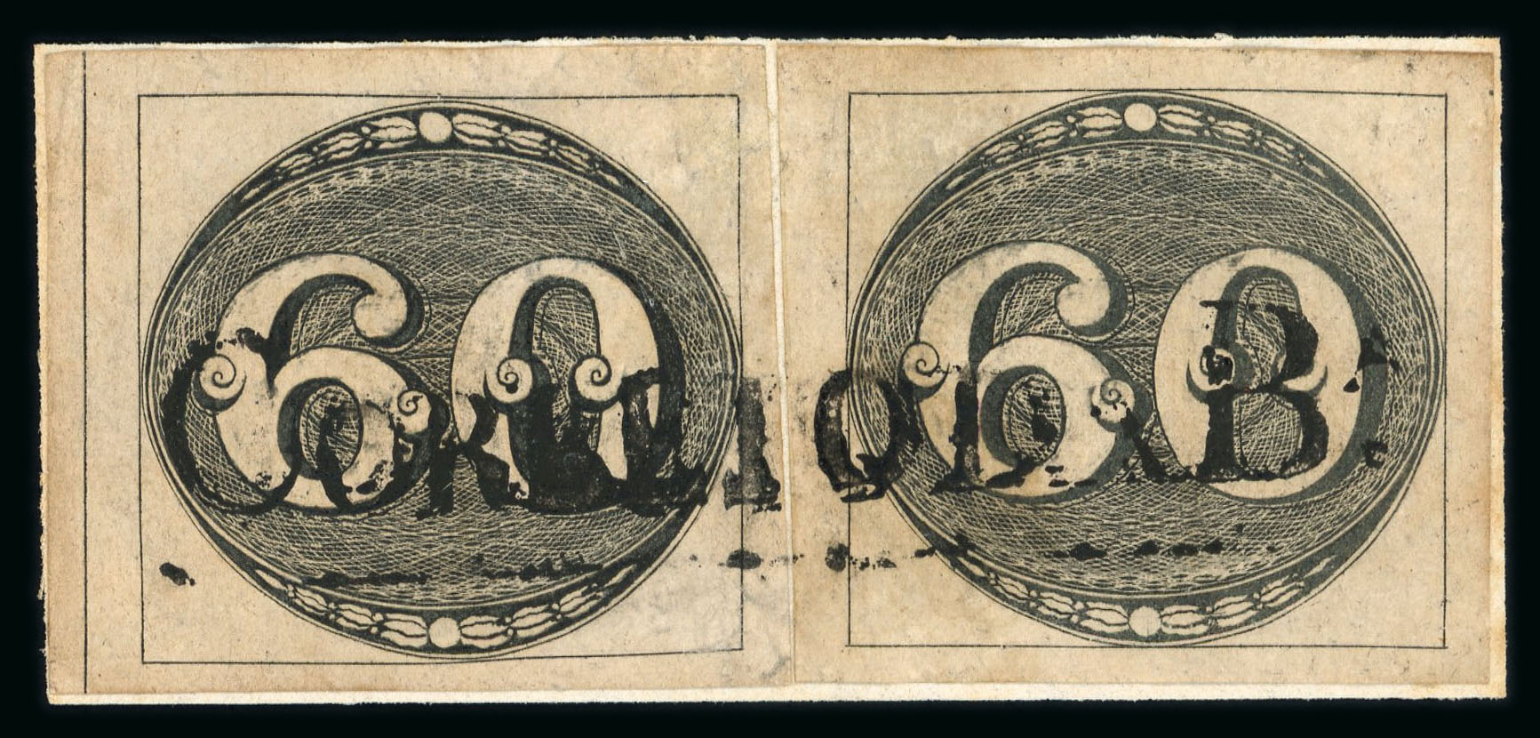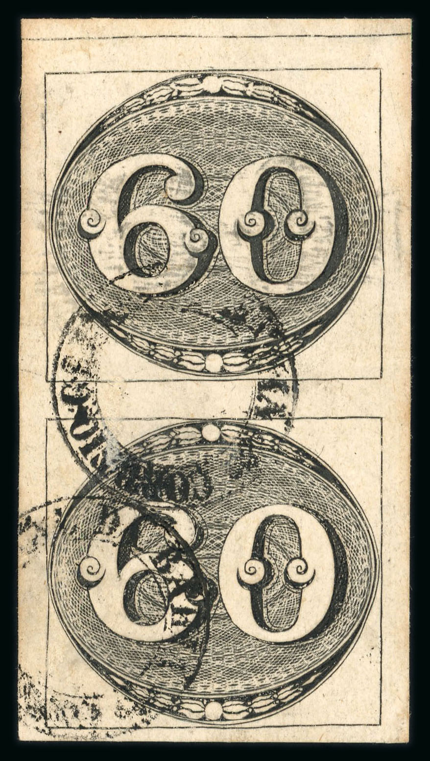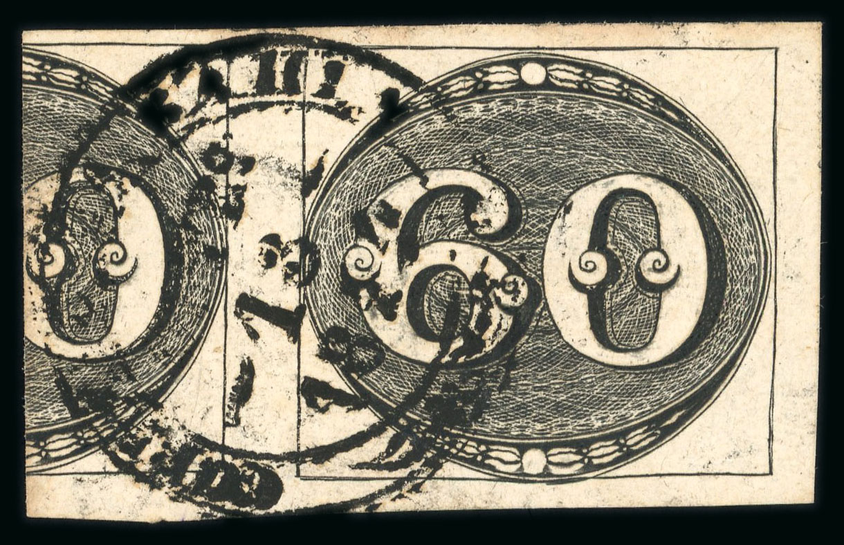 Bahia: 60r. early impression re-joined vertical pair, four margins cancelled by large part Correio Da Bahia double-ring date stamp (Ayres 1605). The pair roughly separated and rejoined. (Image 1)