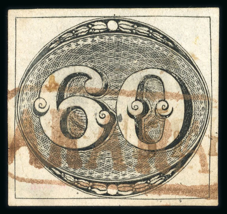 Arara (PI) 1843 60r. black four even margins used with very large part dark brown/maroon handstamp, small rust spot at bottom left with small 2mm tear there, Ayres 1204, unpriced RHM for 60r. (Image 1)
