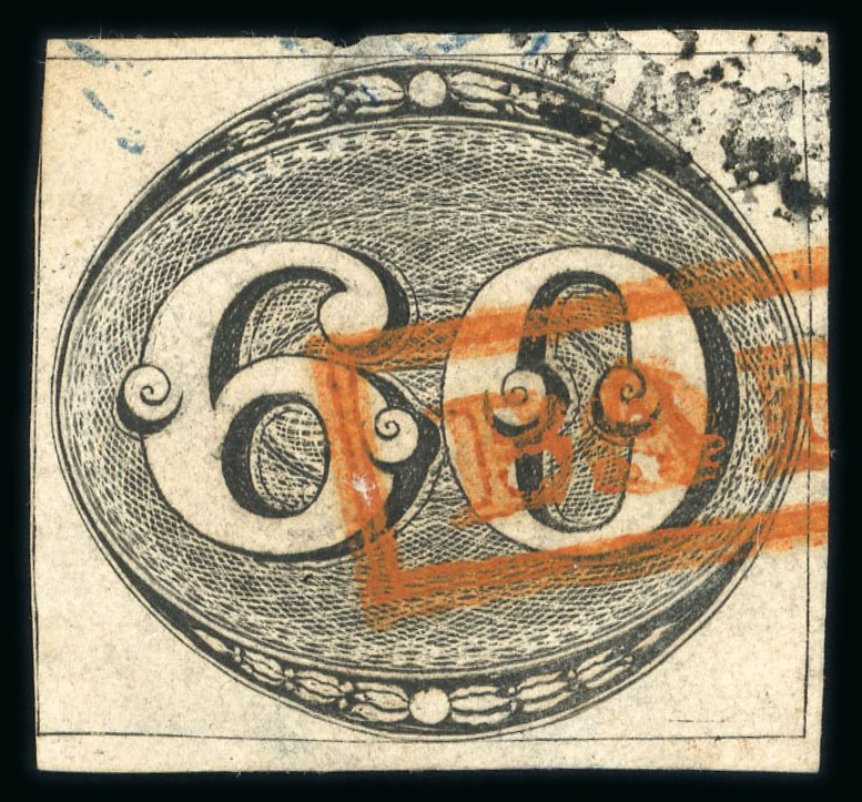 Baependy (MG): 60r. black clear to touched margin at left used with part bold vermilion handstamp, part of unclear black cancel at top right, small thin in top margin, unique in this colour, as illustrated in Ferreira page 22. (Image 1)