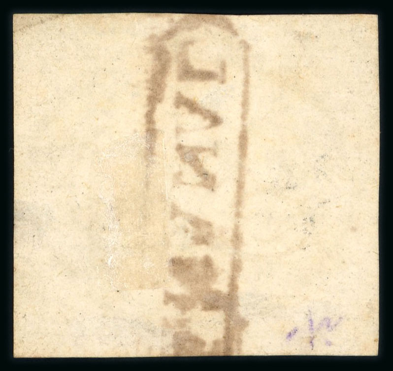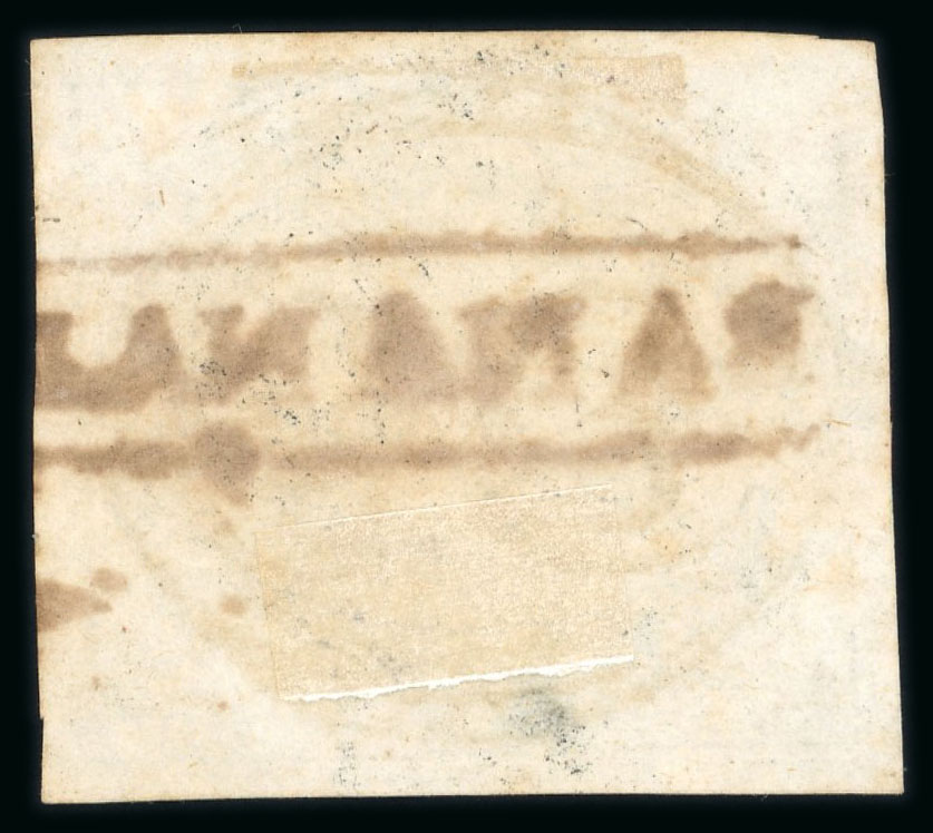 Arara (Pl): 1843 early impression 30r. black, close to good margins, bearing very large part unframed black handstamp reading upwards, some slight toning not unduly distracting, unlisted in Ayres or RHM, but in Ferreira who suggests it is
