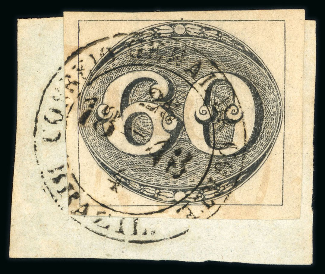 Corte (Correio Geral Da Brazil) (RJ): 60r. black early impression, close to good margins tied to small piece by the scarce double circle date stamp of 25/4 1843 (wrong year ! Ayres 1610), the stamp has been lifted from the piece and