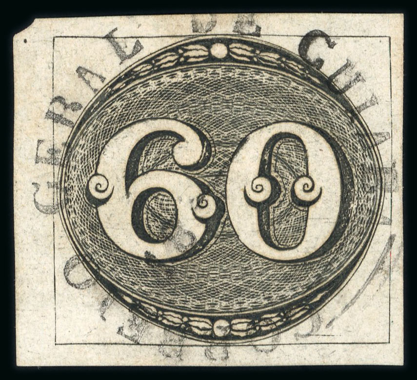 Cutia (SP): 60r. black, four good to large margins with full dividing line at right showing large part manuscript cancel "(Cu)tia 30 de jun(ho)", illustrated on page 222 of Ferreira, small central thinning with resultant tiny hole. (Image 1)